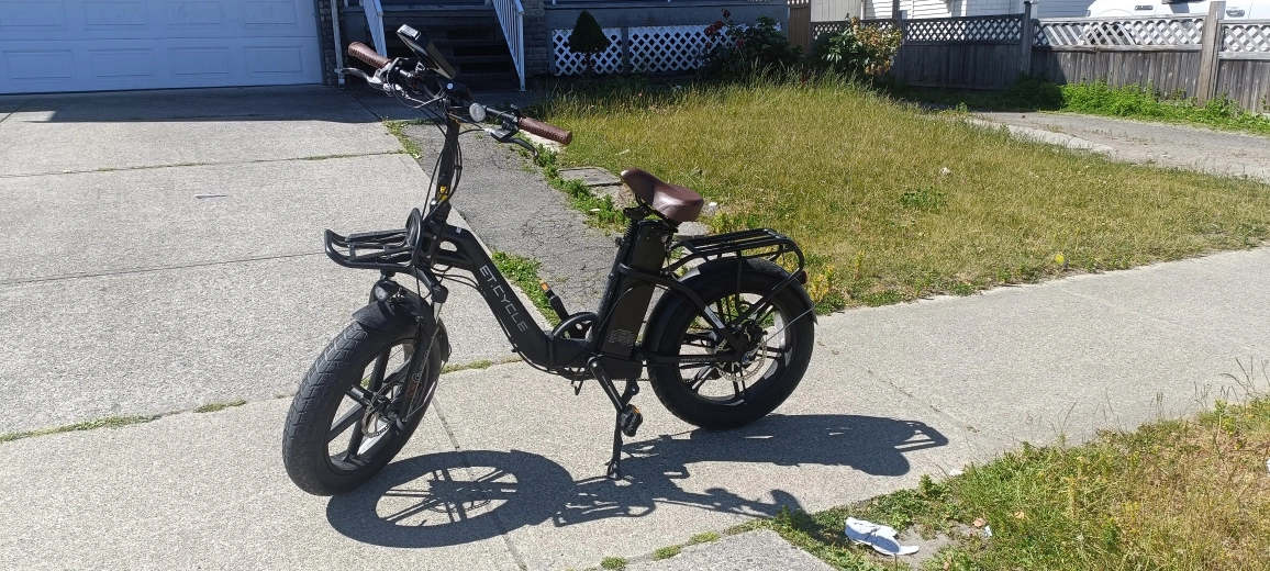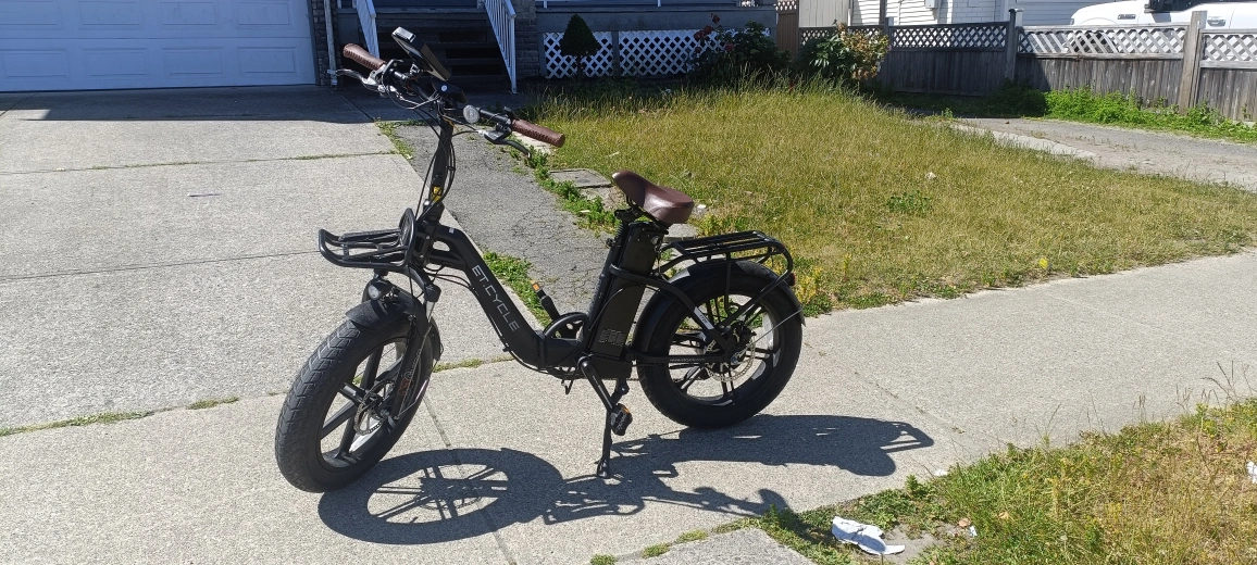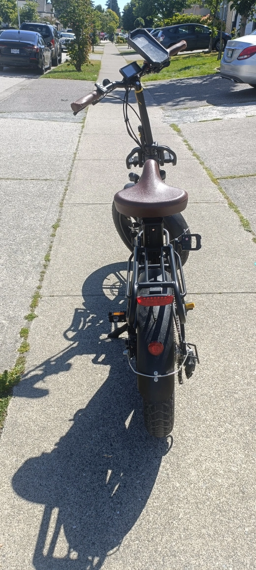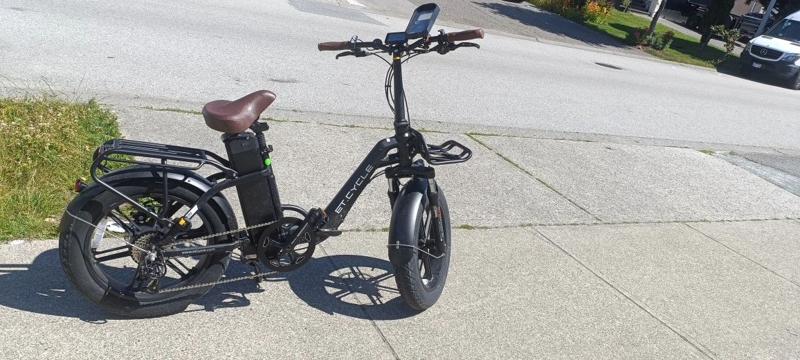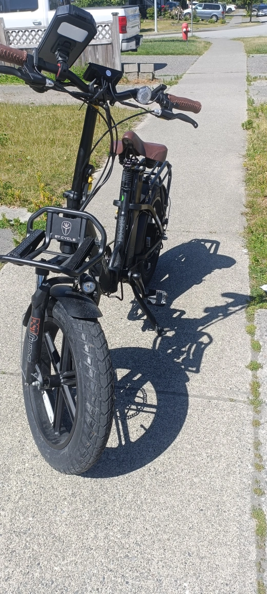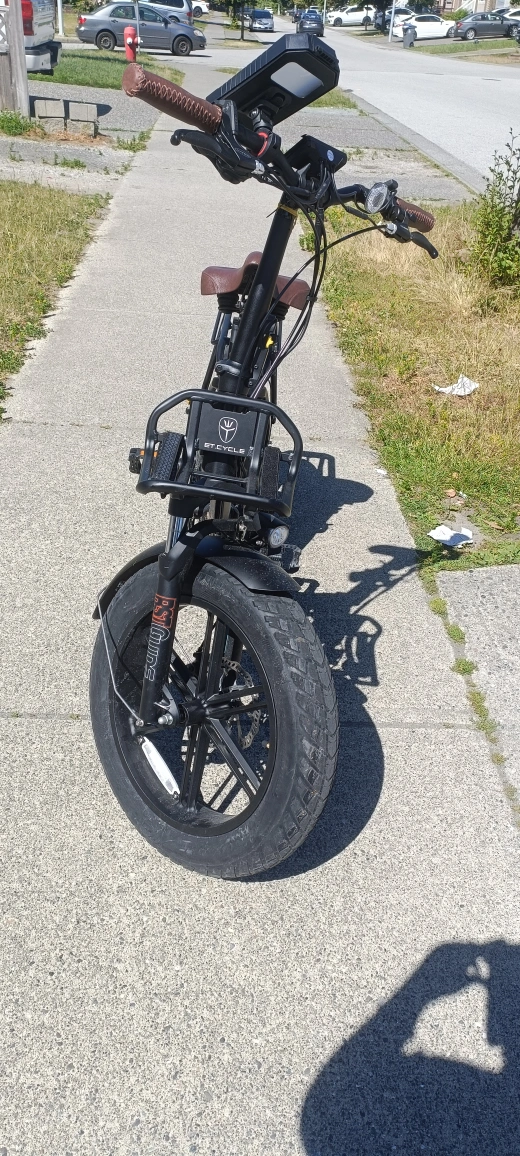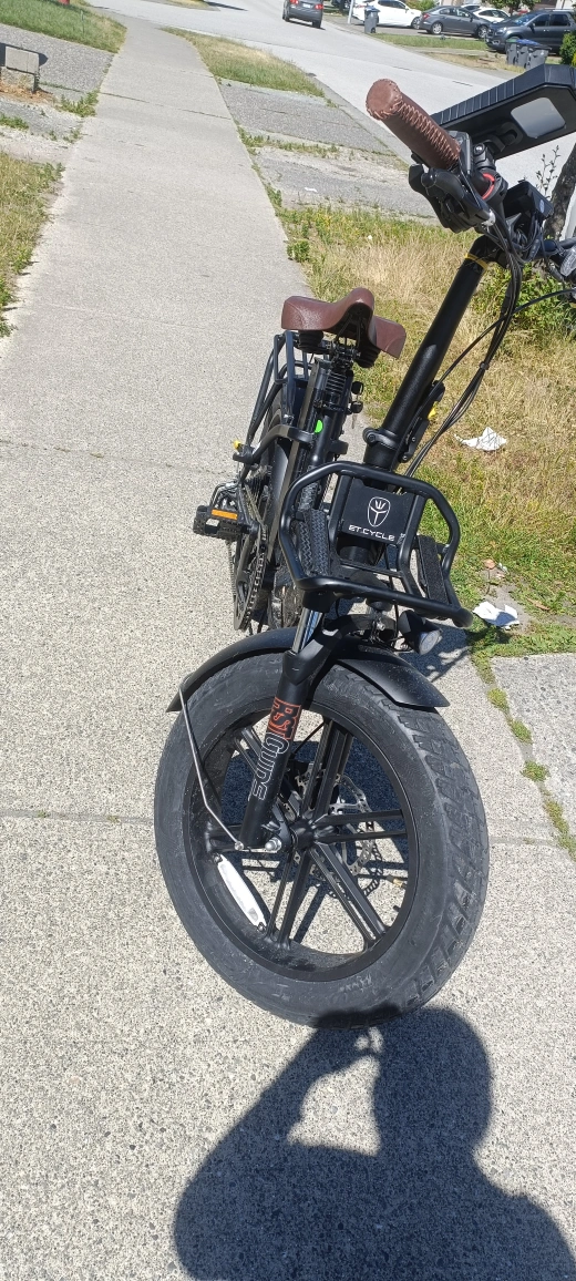 Folding electric bike. Fat tyres. Brown leather seat. Front and rear carriers. Digital display. Excellent condition.