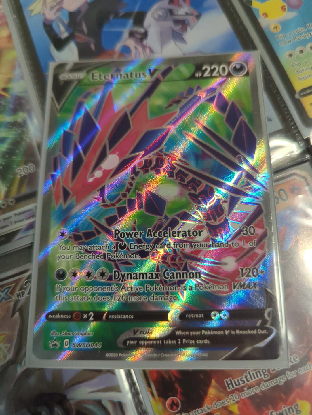 Selling an Eternatus V Pokemon card. It's in great condition and ready for a new home! This card features Power Accelerator and Dynamax Cannon. A cool addition to any Pokemon collection
