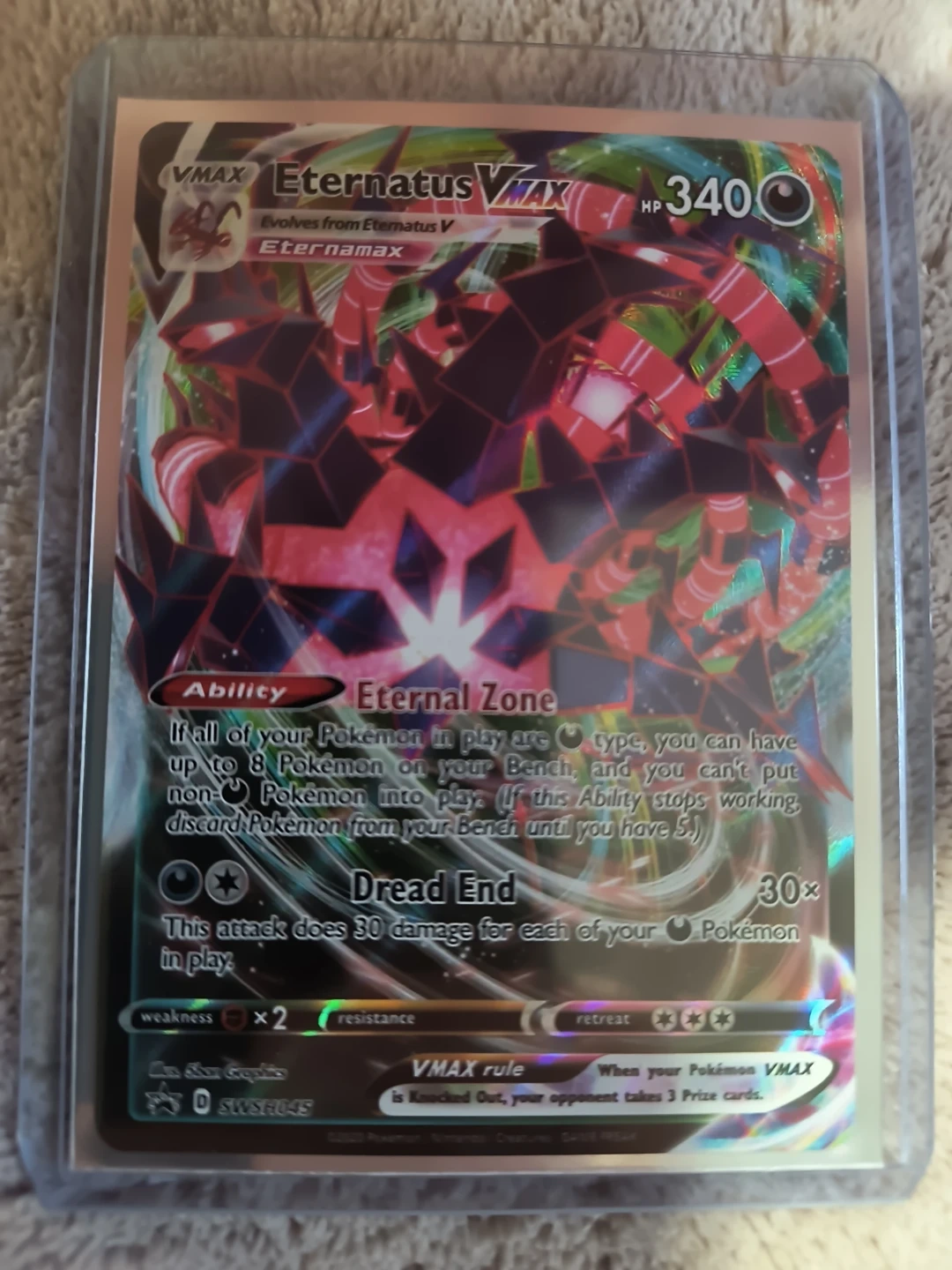 134Selling an Eternatus VMAX Pokemon card. It has an ability called Eternal Zone, and an attack called Dread End. It evolves from Eternatus V and has 340 HP! Feel free to message me if you're interested!