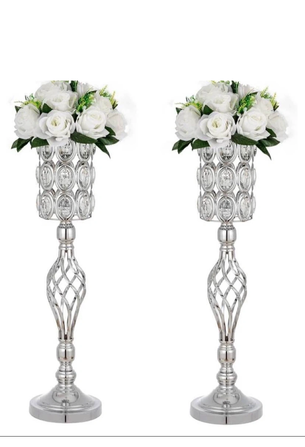 A pair of elegant silver vases with crystal accents. They feature a decorative twisted stem and a detailed base. Includes artificial white roses and greenery.