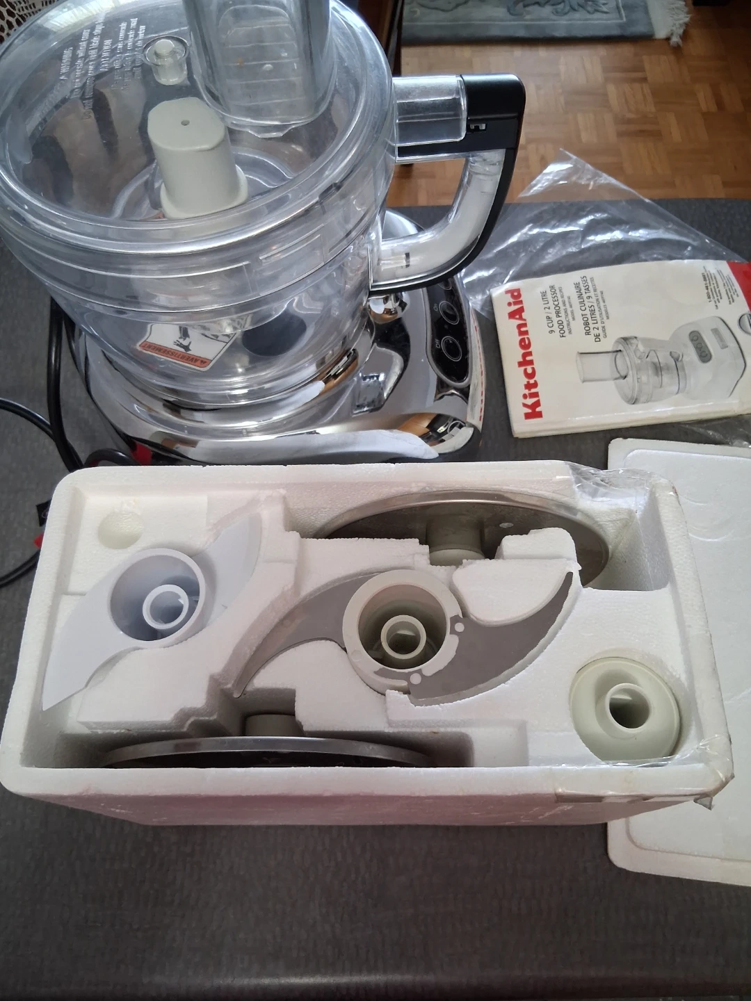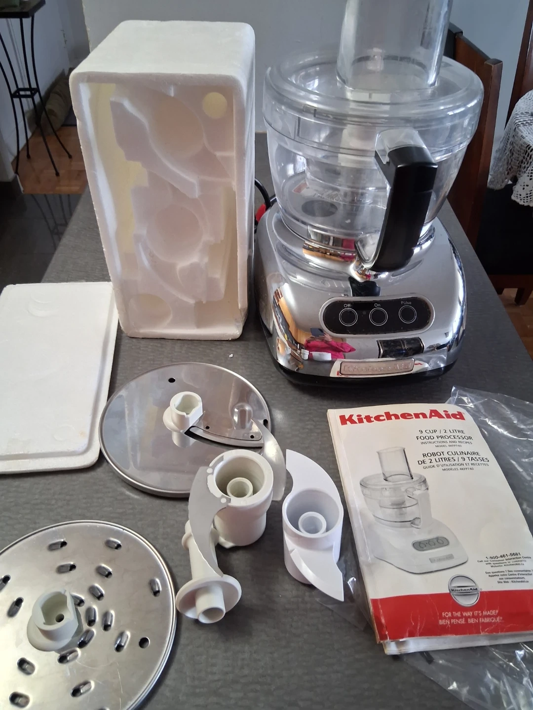 KitchenAid 9 cup food processor, model 4KFP740. It has a 2 litre capacity. Includes all blades and instructions.