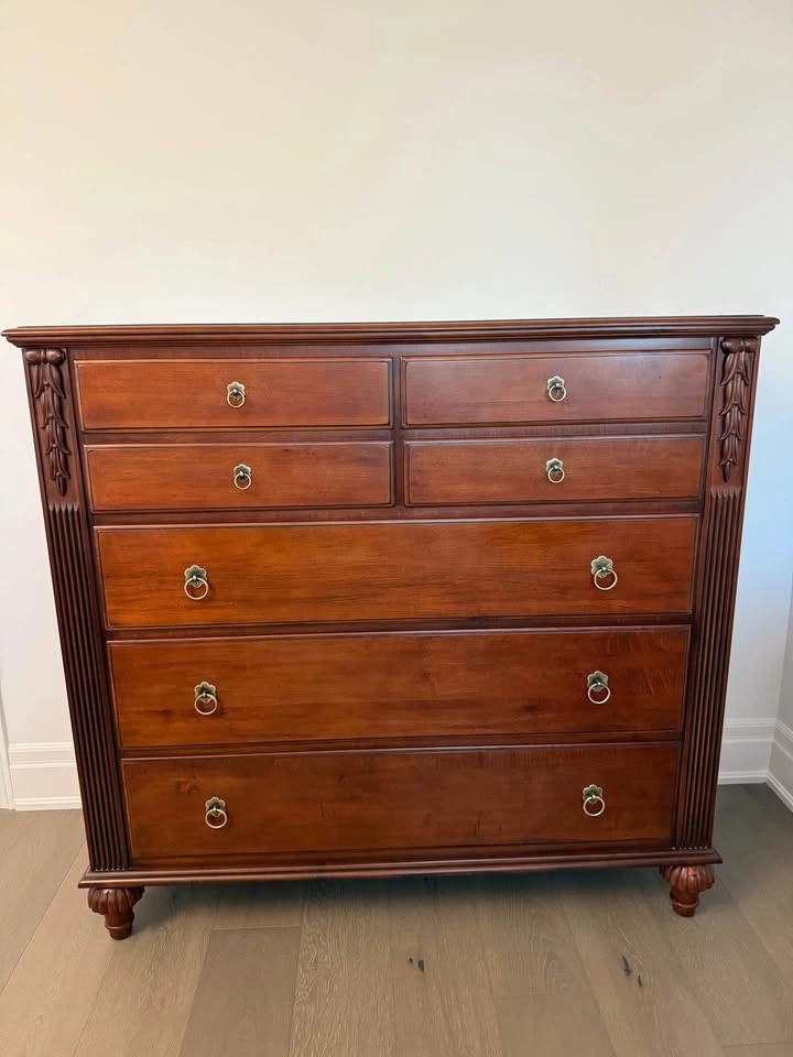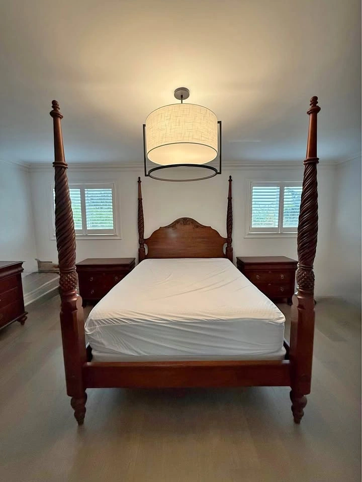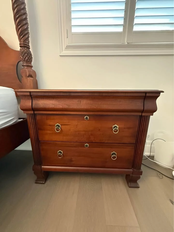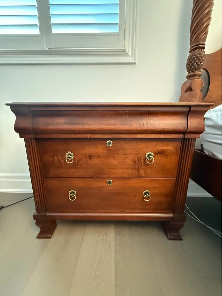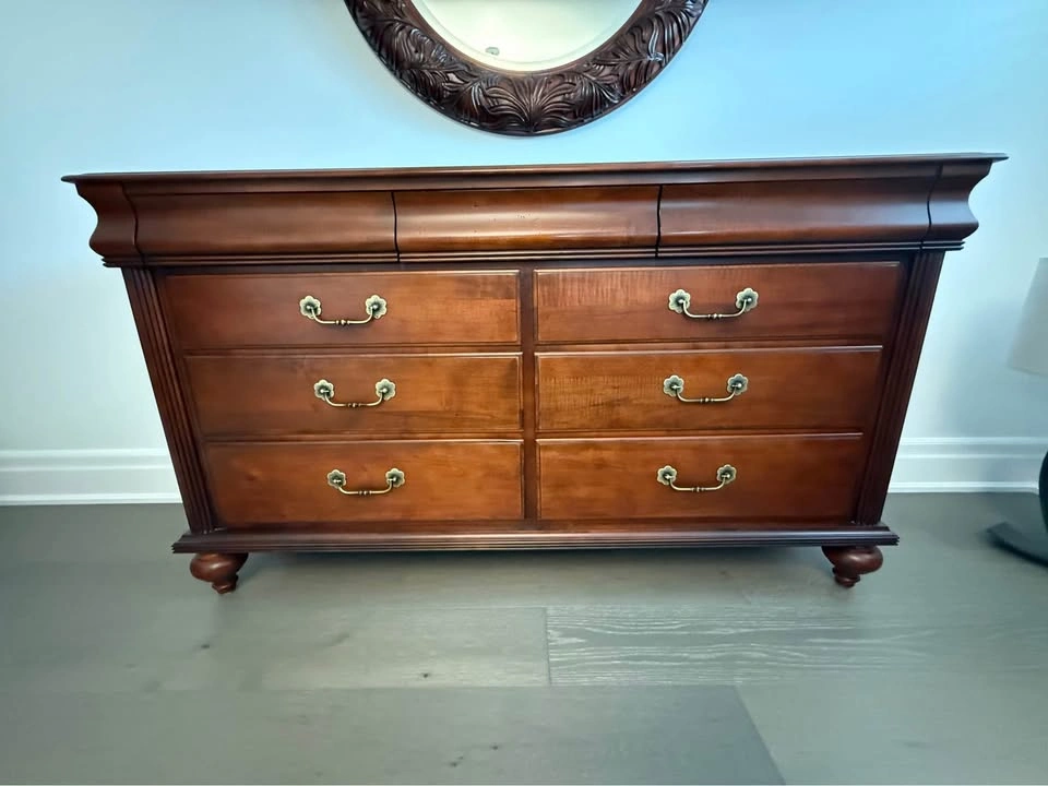 Ethan Allen bedroom set. - Queen side four post bed frame with box spring, mattress not included 67” wide x 90 “ long x 87” high $1000 - 2 bedside tables, 1 top drawer, 2 deep drawers 36” wide x 17” deep x 30” high $200 each - wide dresser, 3 top drawers, 6 deep drawers 63” wide x 19” deep x 36 “ high $300 - tall dresser, 4 top drawers, 3 deep drawers 52” wide x 20” deep x 49 “ high $300 - round mirror 40” diameter $200 The entire set for $2000. Bed frame will be disassembled. Pick up in Burlington