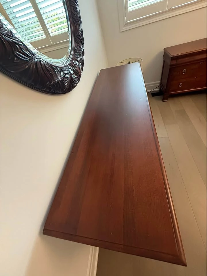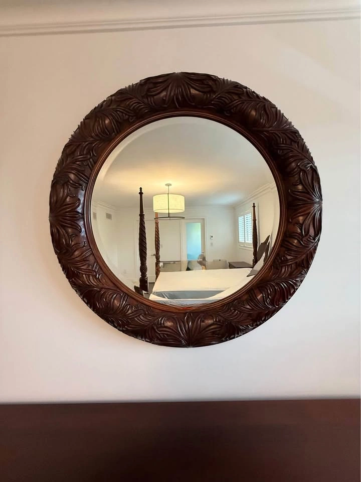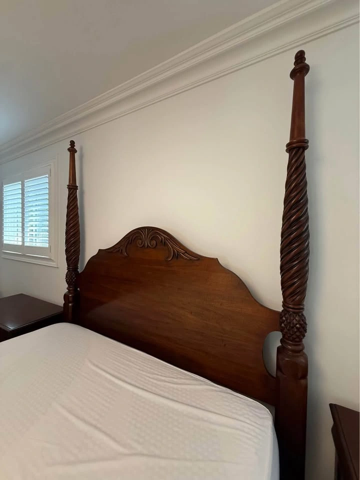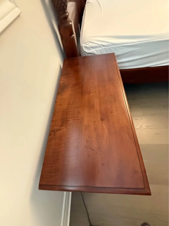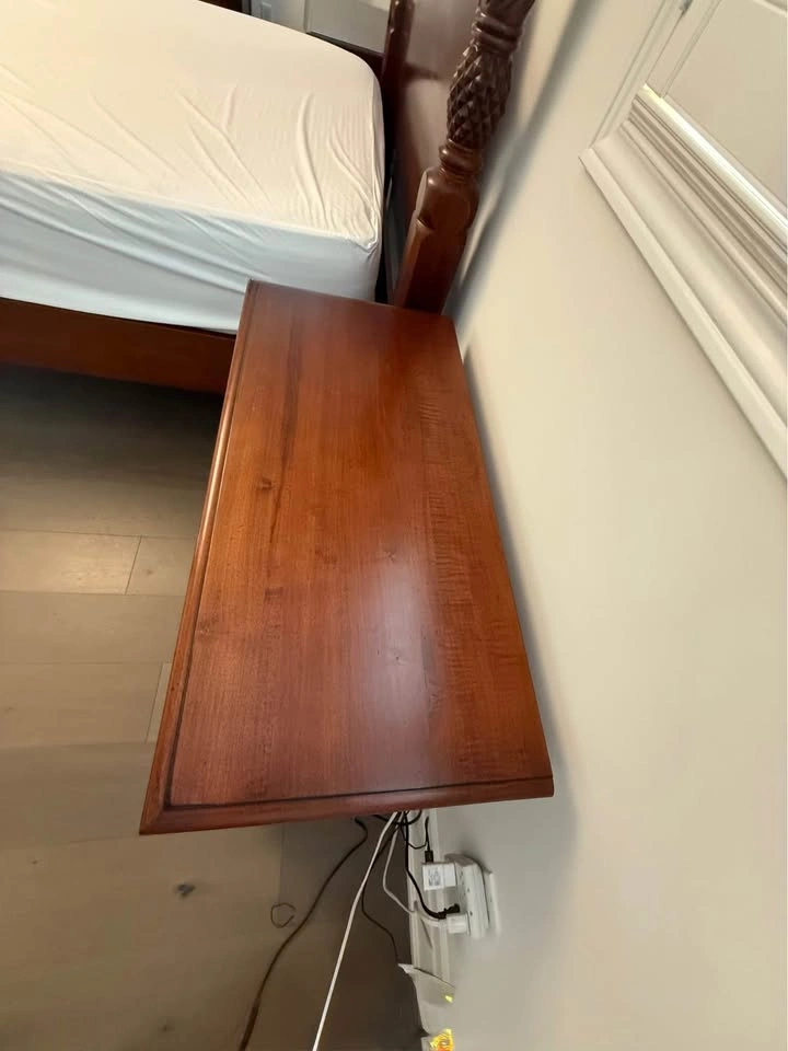 Ethan Allen bedroom set. - Queen side four post bed frame with box spring, mattress not included 67” wide x 90 “ long x 87” high $1000 - 2 bedside tables, 1 top drawer, 2 deep drawers 36” wide x 17” deep x 30” high $200 each - wide dresser, 3 top drawers, 6 deep drawers 63” wide x 19” deep x 36 “ high $300 - tall dresser, 4 top drawers, 3 deep drawers 52” wide x 20” deep x 49 “ high $300 - round mirror 40” diameter $200 The entire set for $2000. Bed frame will be disassembled. Pick up in Burlington
