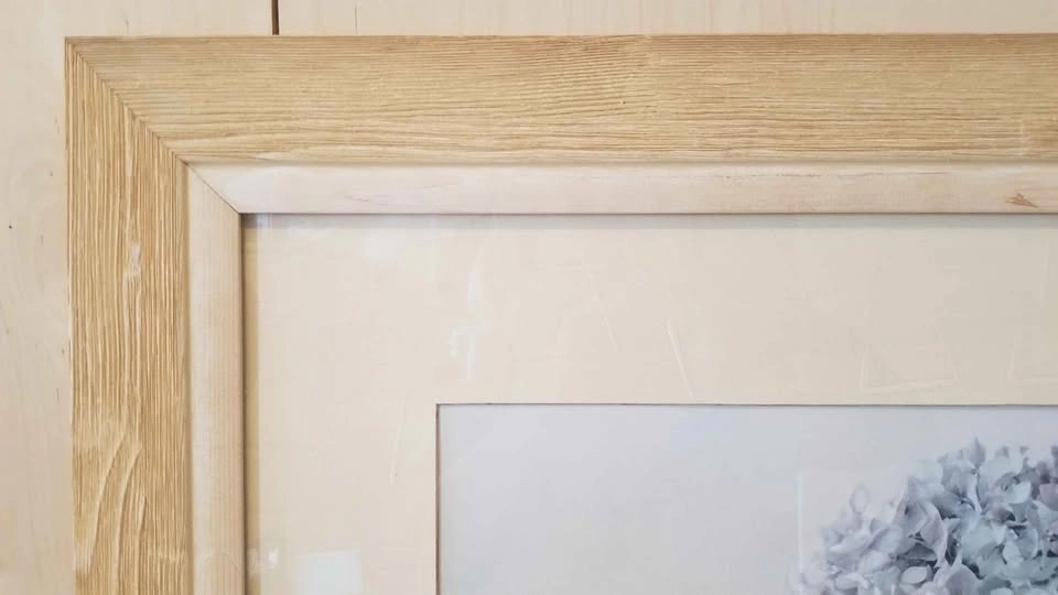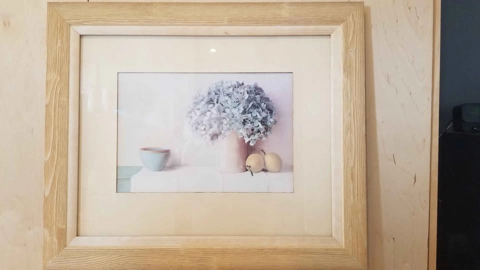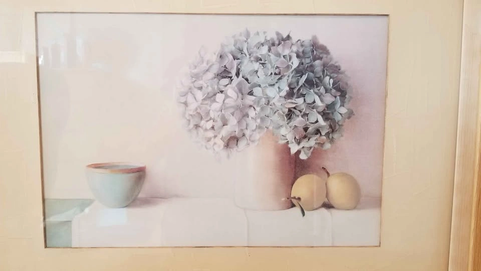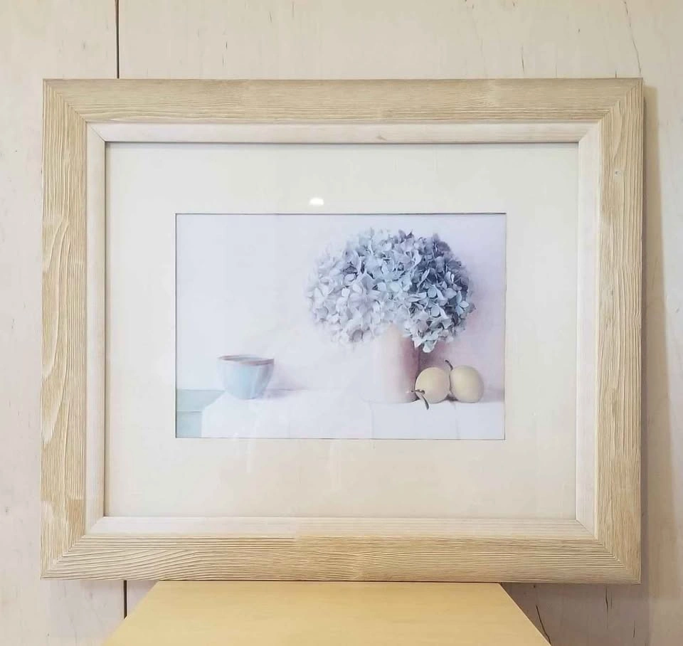25Hydrangea, pears and teal bowl minimalist print. Wooden frame. Textured mat. Glass. Muted colors. Originally purchased at Ethan Allen. 28" wide 231/2" high. I love it, just have no place for it...