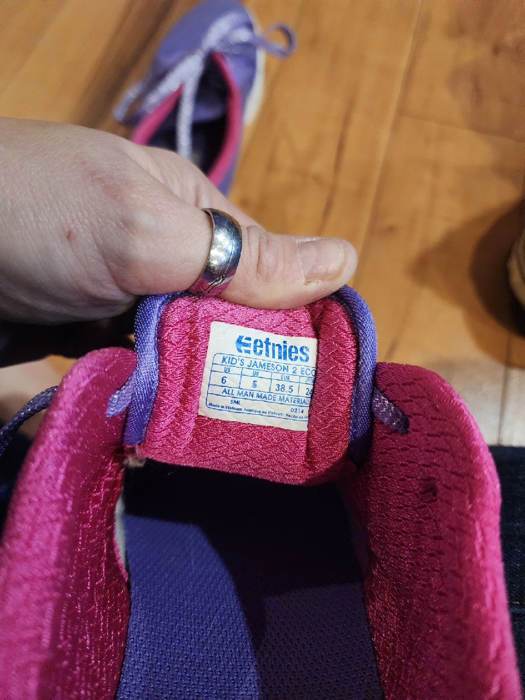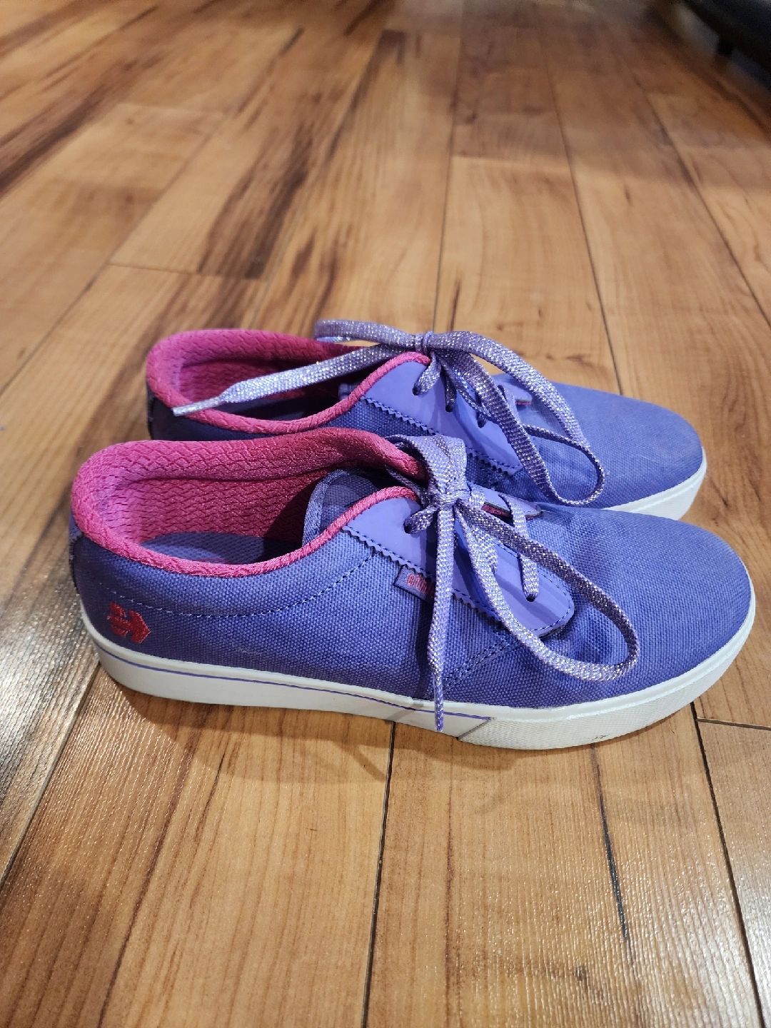 Selling a pair of Etnies Kids Jameson 2 Eco shoes in size 6. They're in great shape and ready for a new home! These shoes feature a stylish purple and pink colour combo.