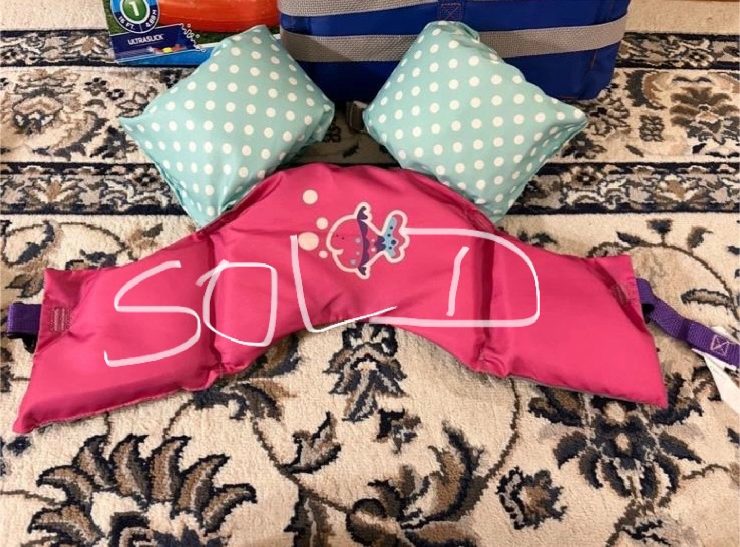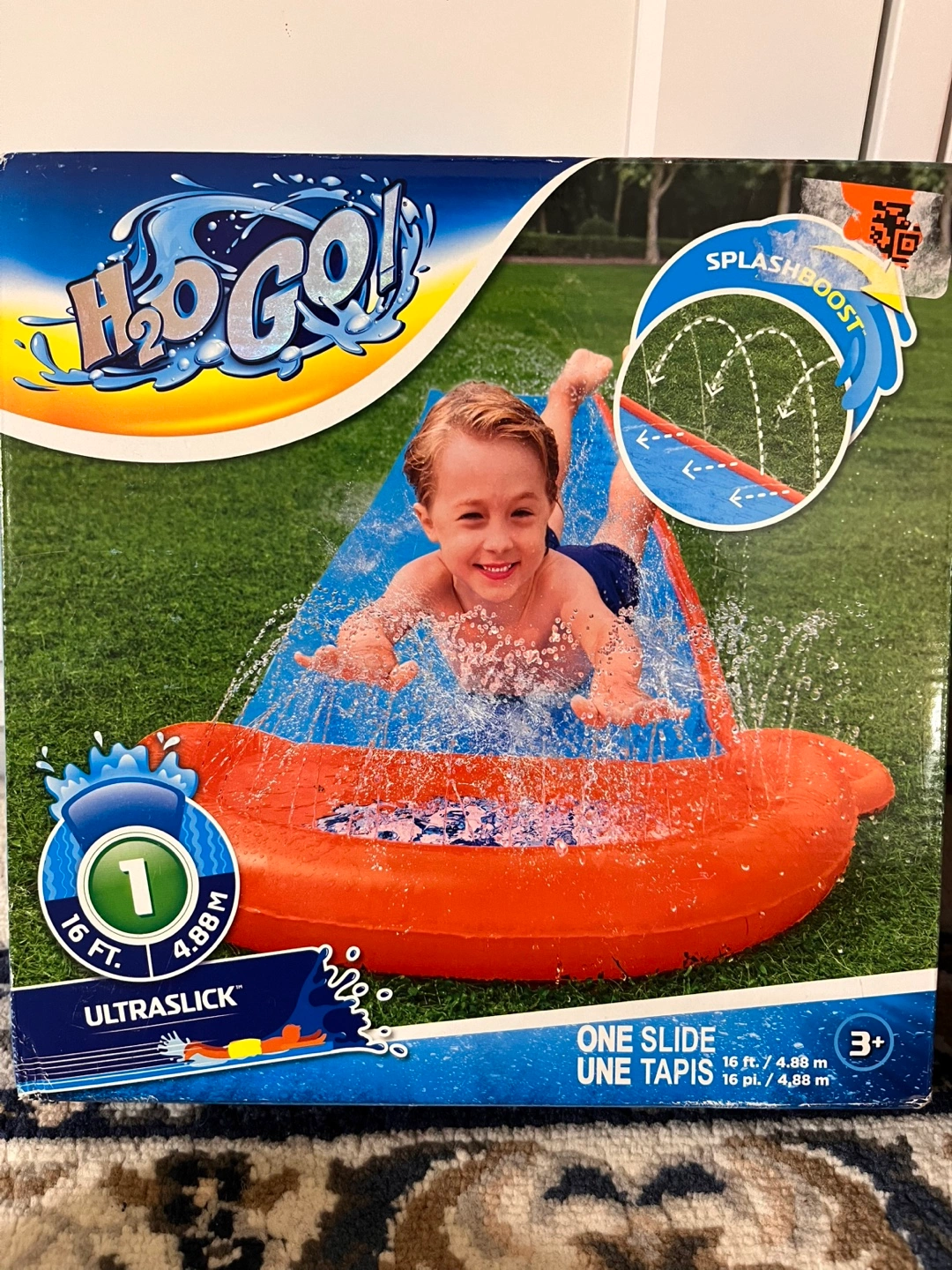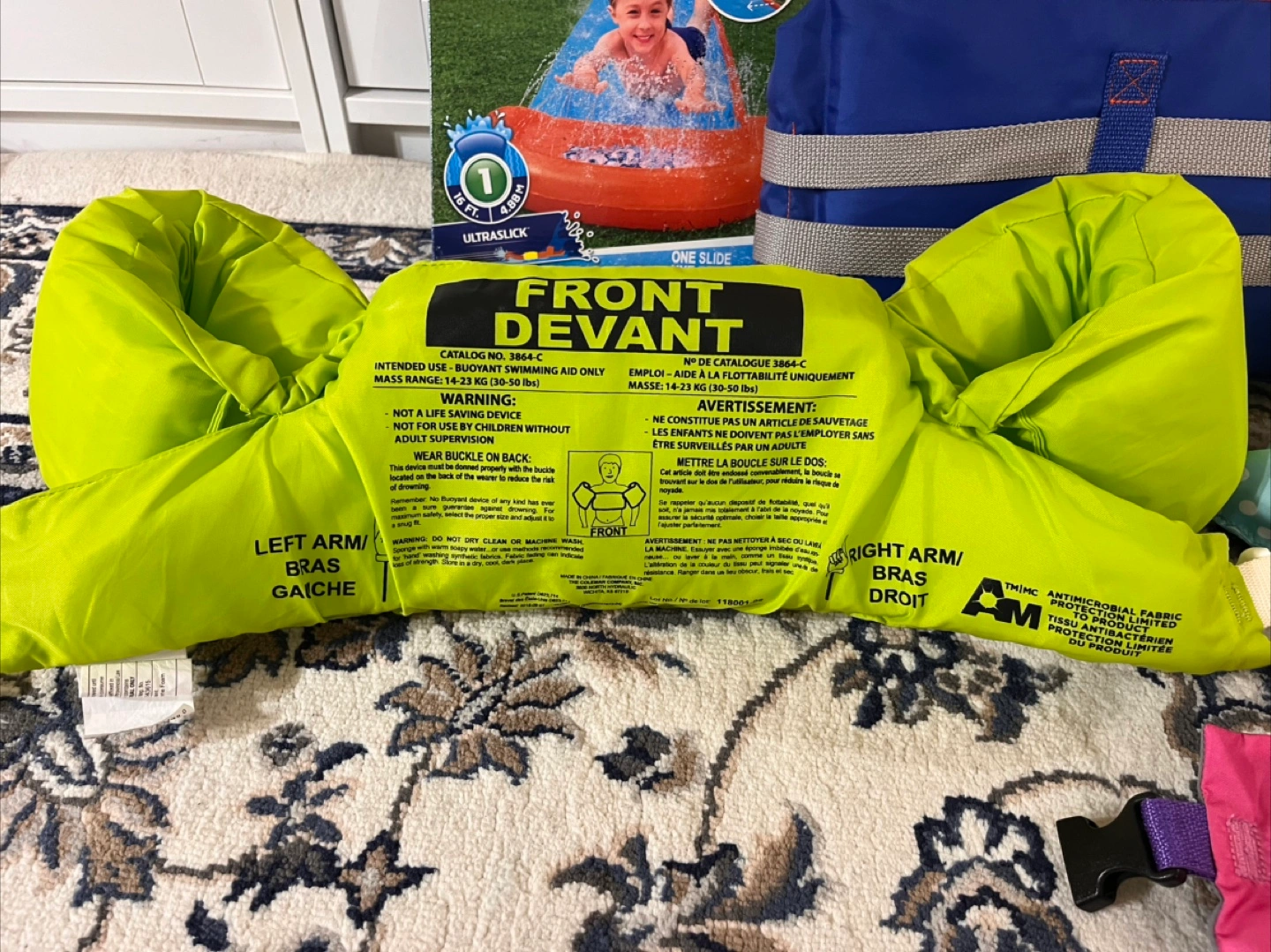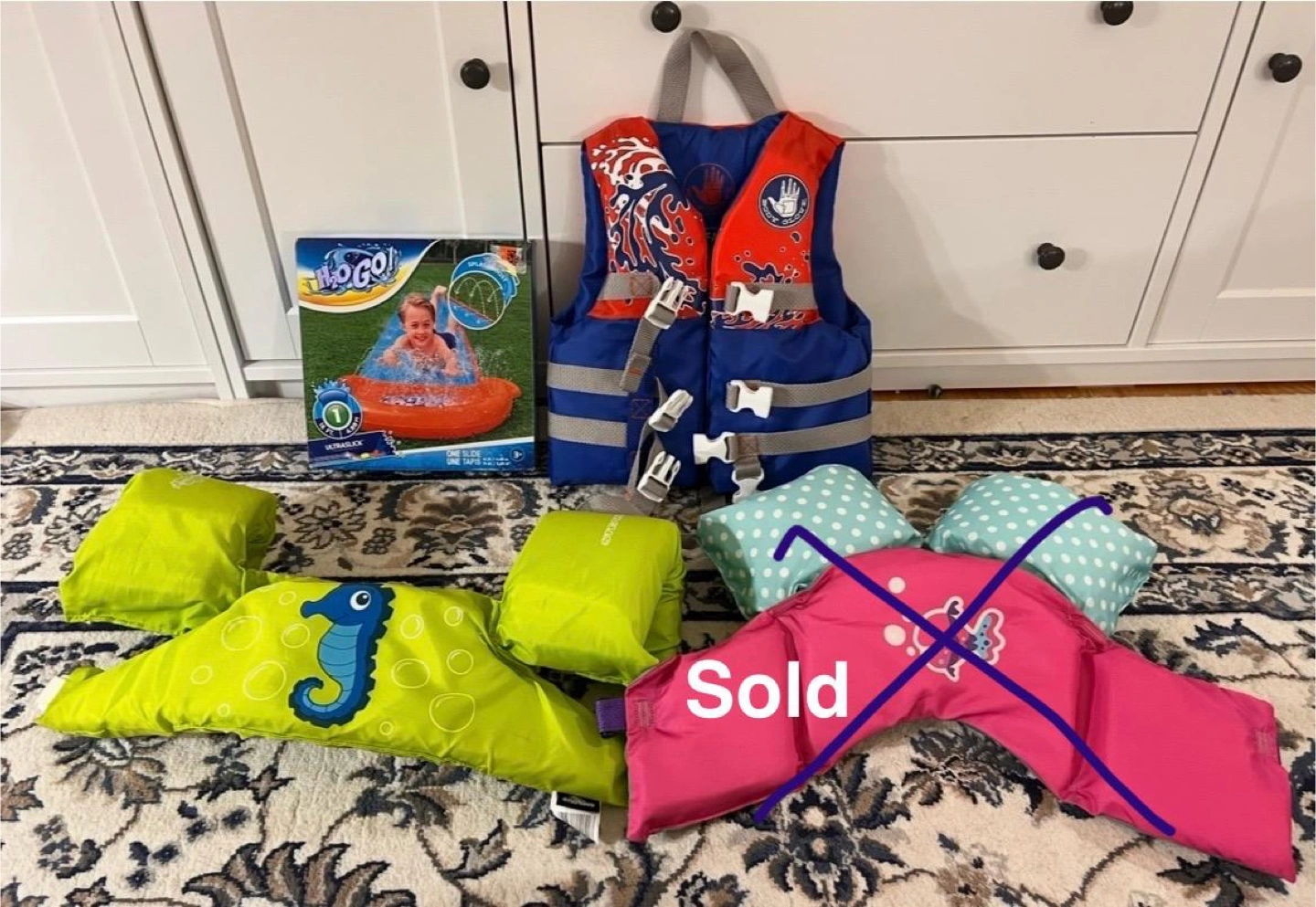 Bundle includes a new H2OGO! SplashBoost one slide water slide and a like new Body Glove child life vest. Also includes three arm floaties. Great for summer fun!