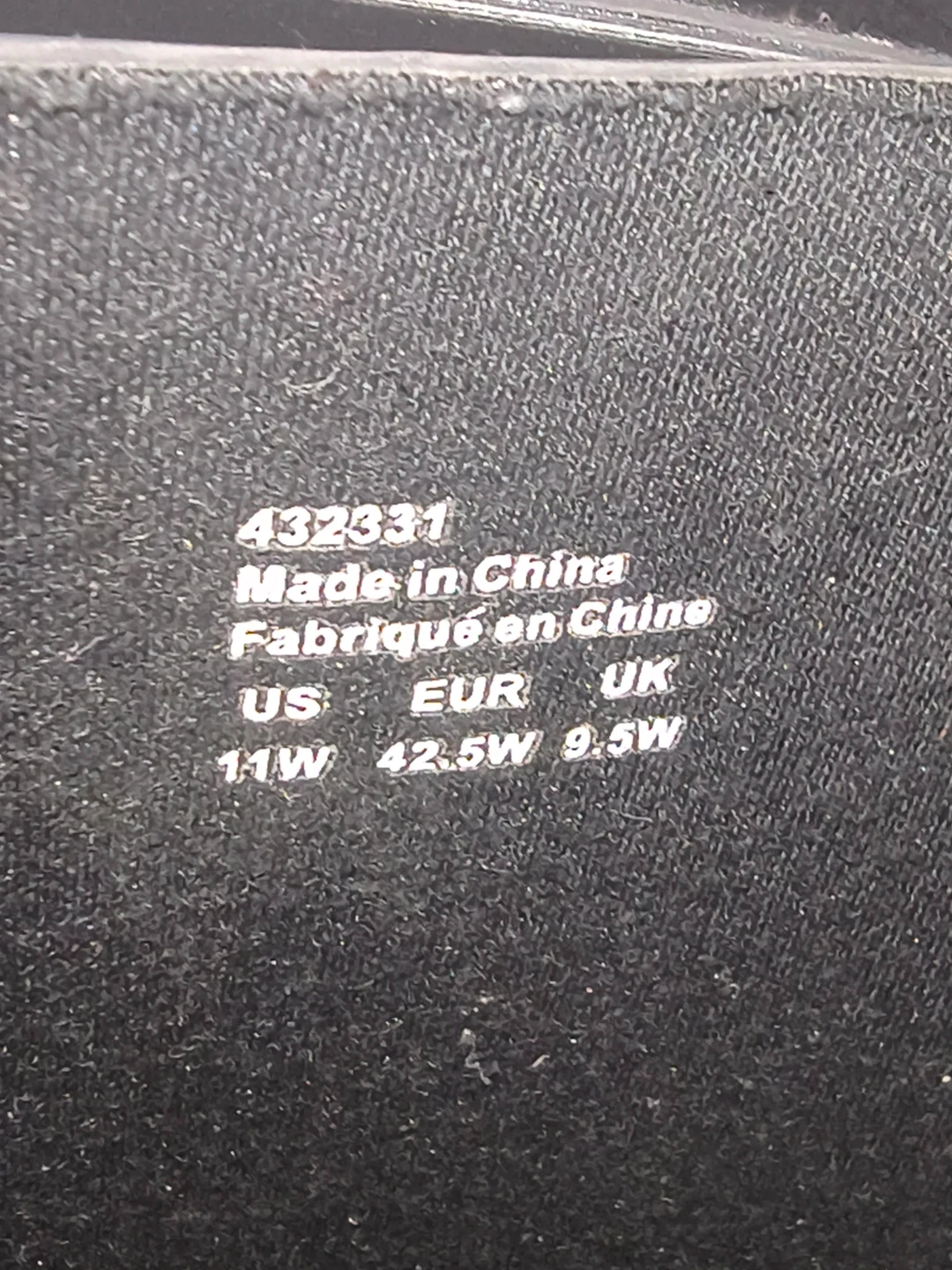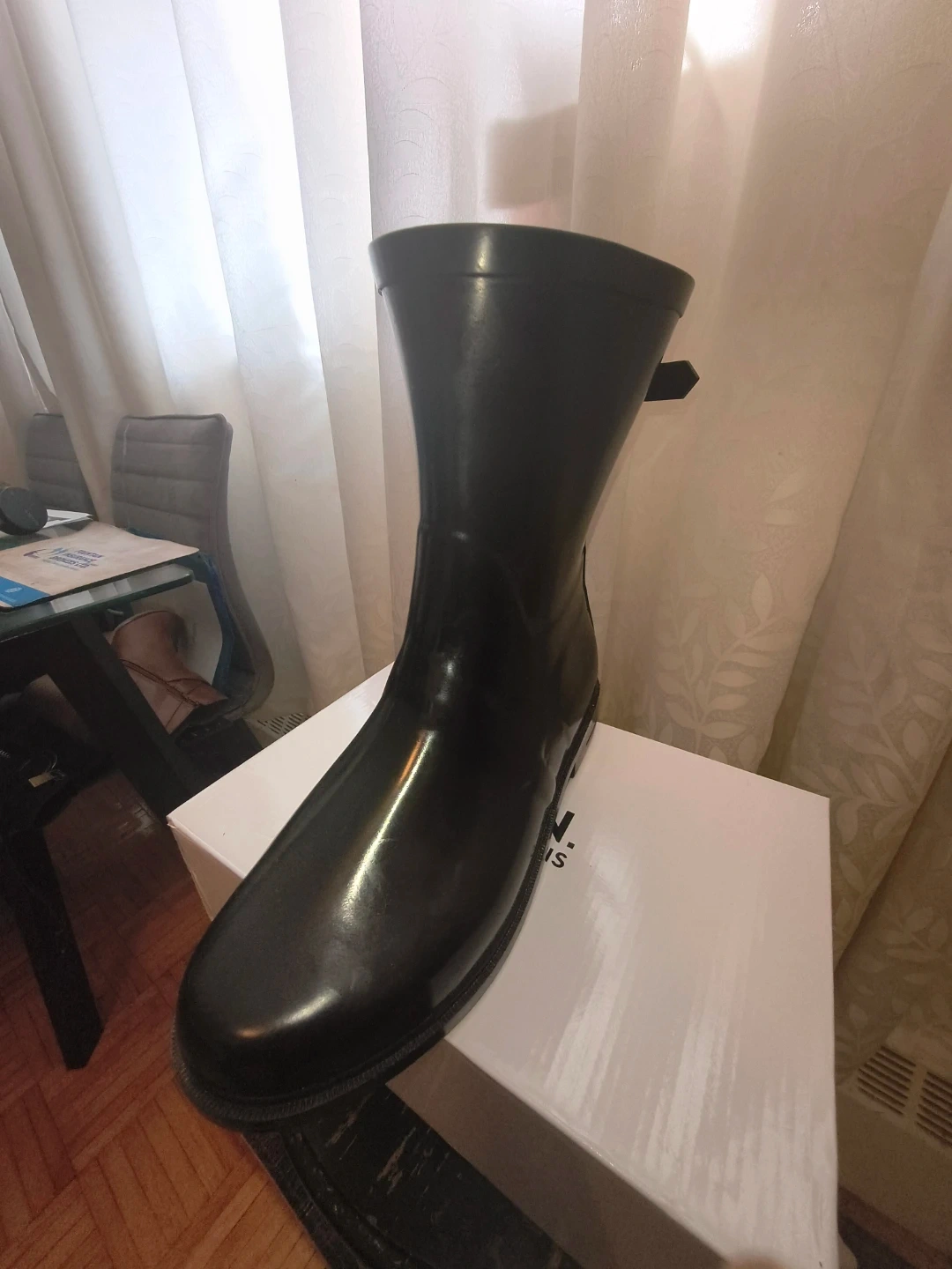 These black rain boots are perfect for keeping your feet dry on wet days. They're made of a durable, waterproof material. A decorative buckle detail is present on the back of each boot. Never worn New