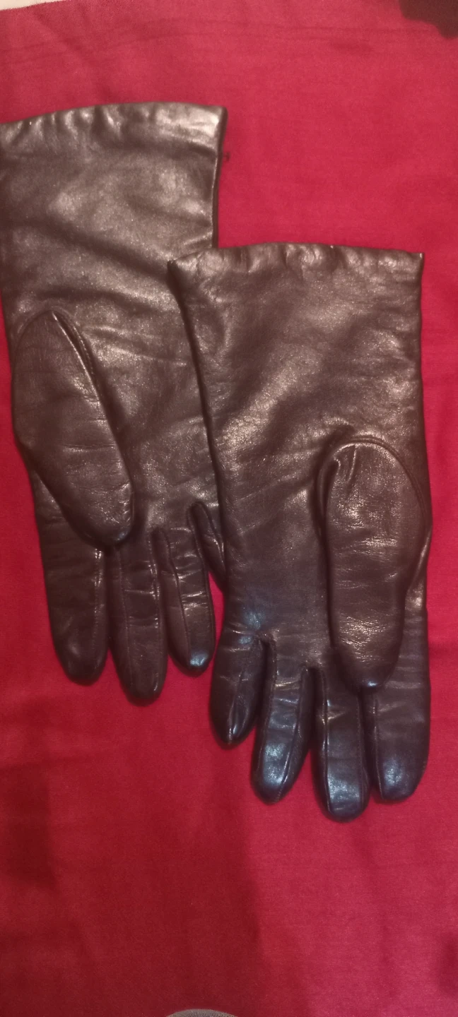 These are a pair of brown leather gloves. The material is genuine leather. They're suitable for keeping your hands warm during cooler weather.