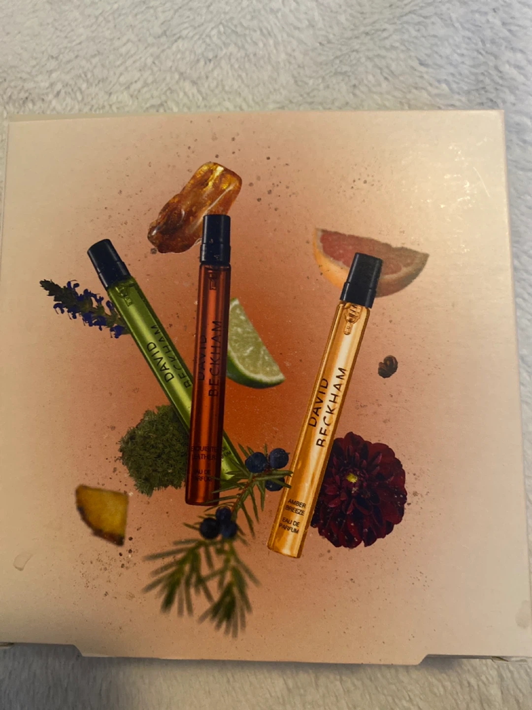 Set of three David Beckham Eau de Parfum fragrances: Exquisite Leather, Botanical Resin, and Amber Breeze. Each bottle is 10 ml. Great for trying out different scents!