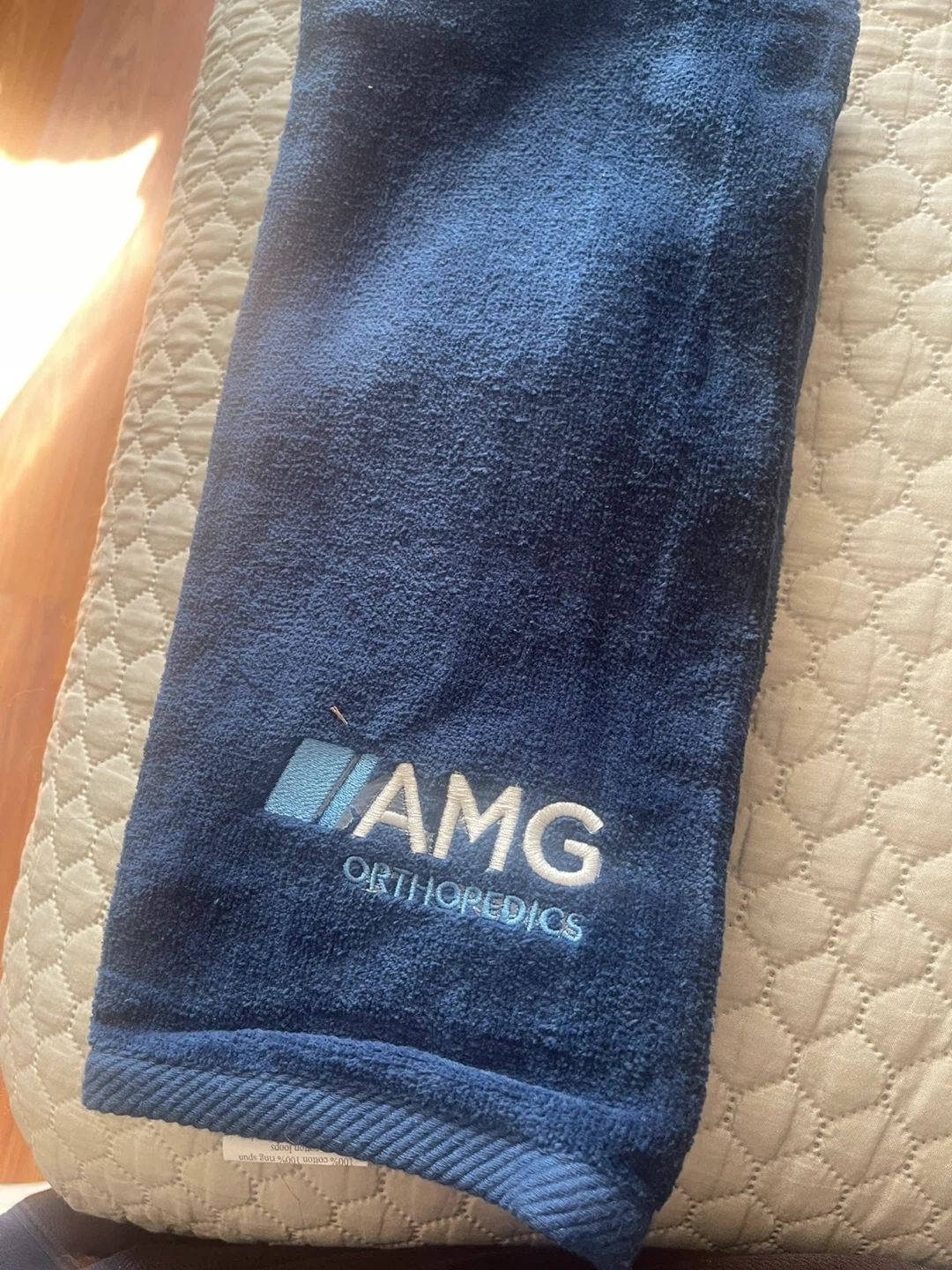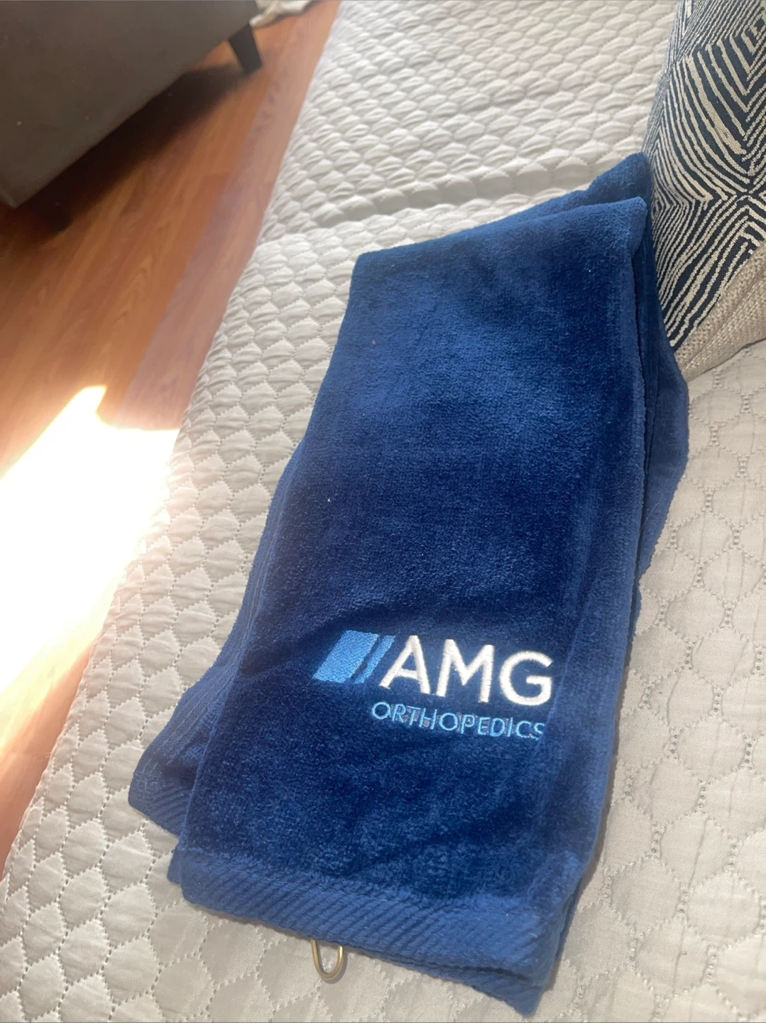 New Blue towel from AMG Orthopedics. It features the brand logo embroidered on the fabric. Includes a hook for easy hanging. Material appears to be terry cloth.