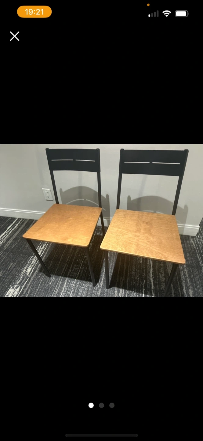 Selling a pair of chairs with wooden seats and black frames. They're in great shape and would be perfect for a kitchen or dining area!