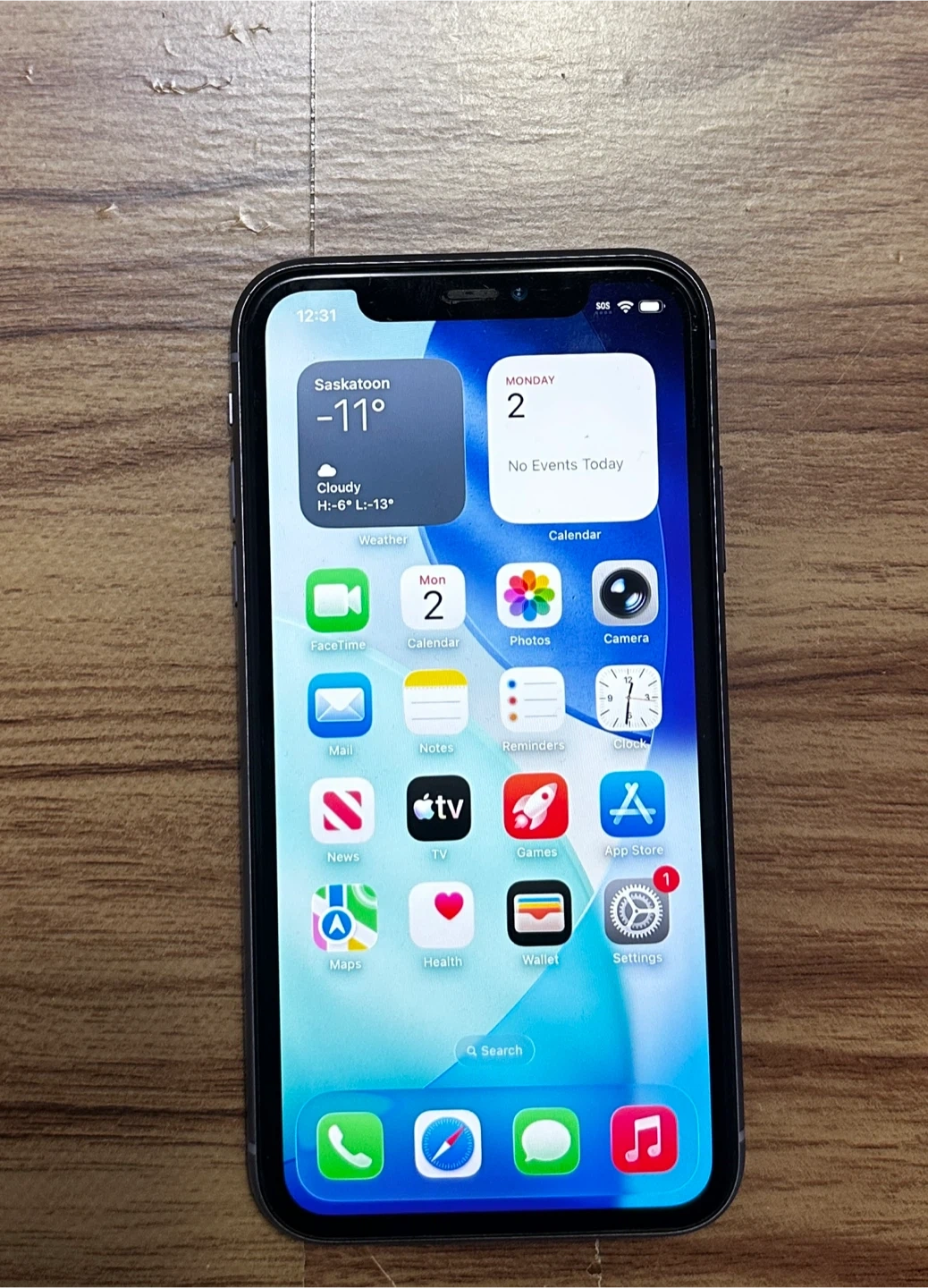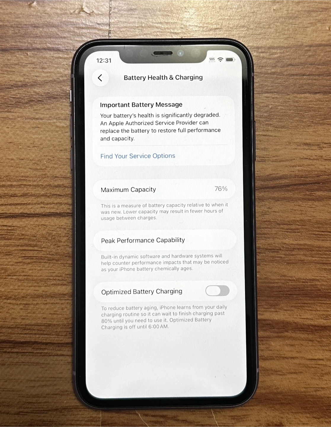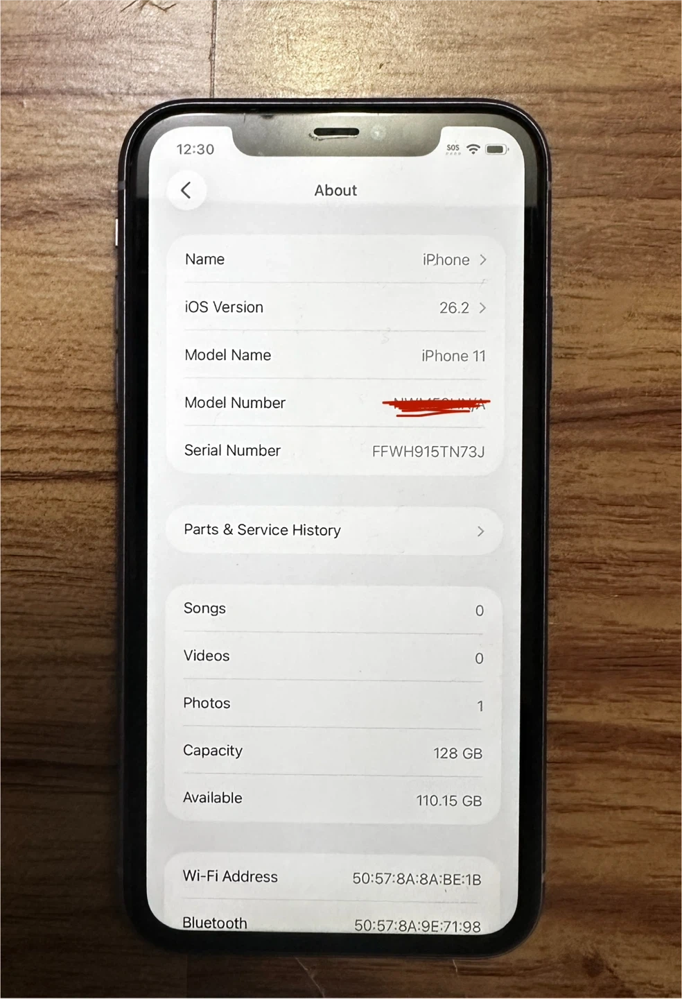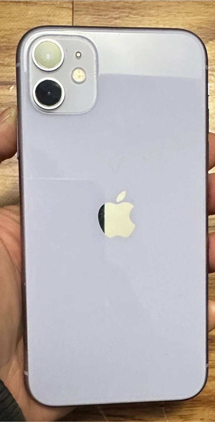 This is an Apple iPhone 11 with 128GB of storage in purple. The battery health is at 76%. It's running iOS version 26.2. The phone comes with its original box.