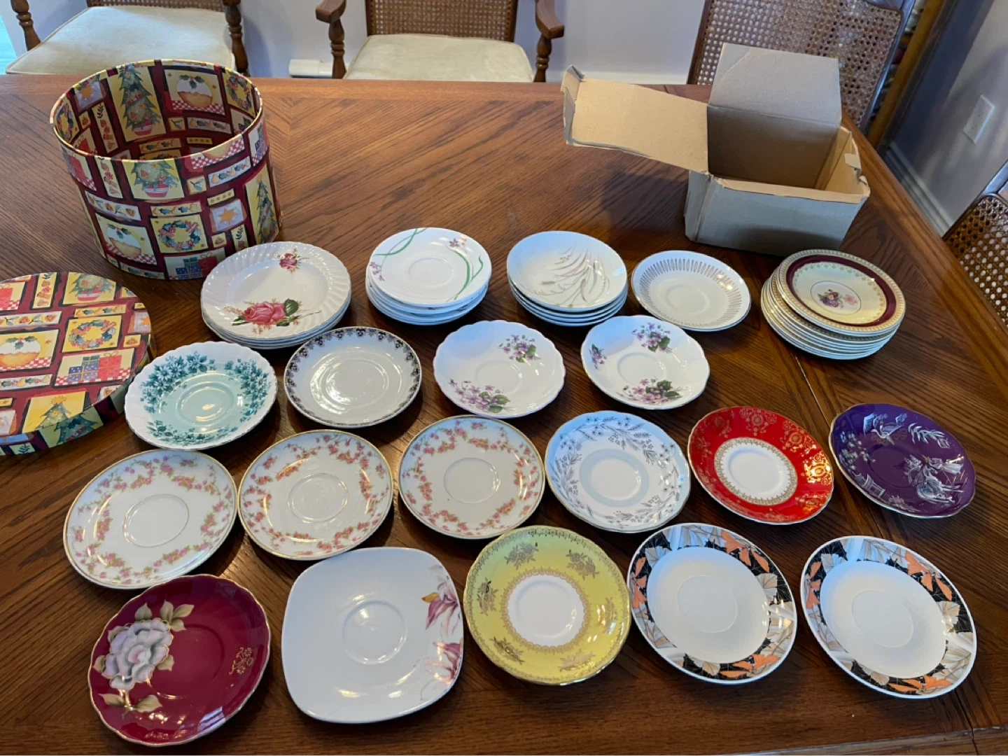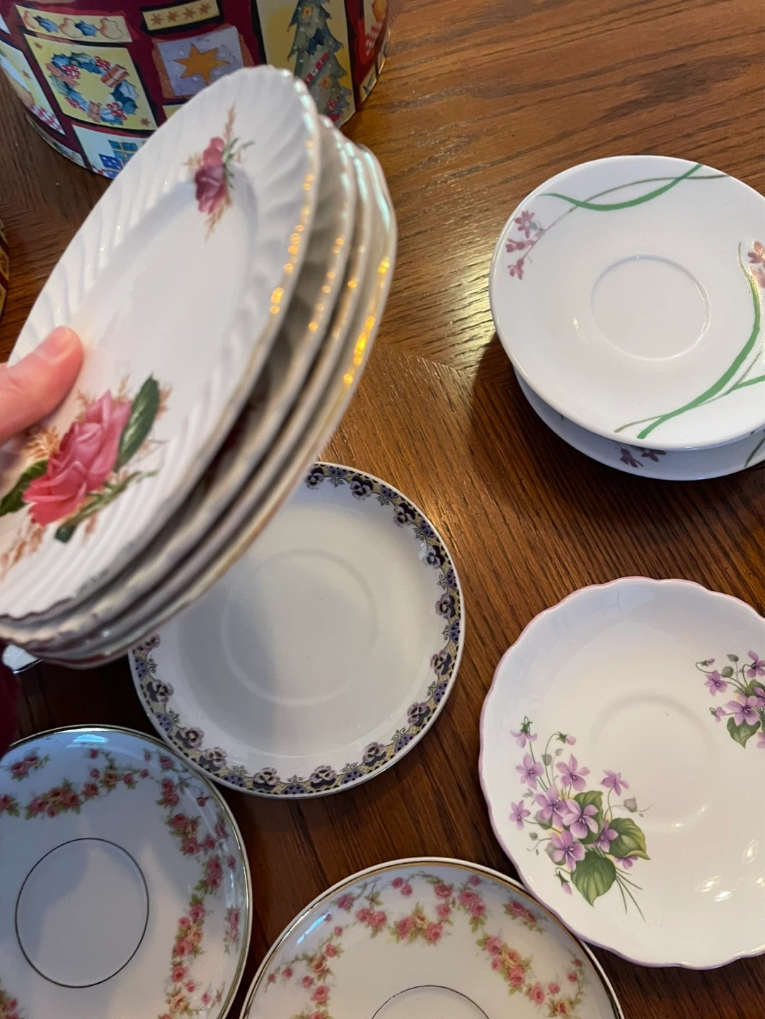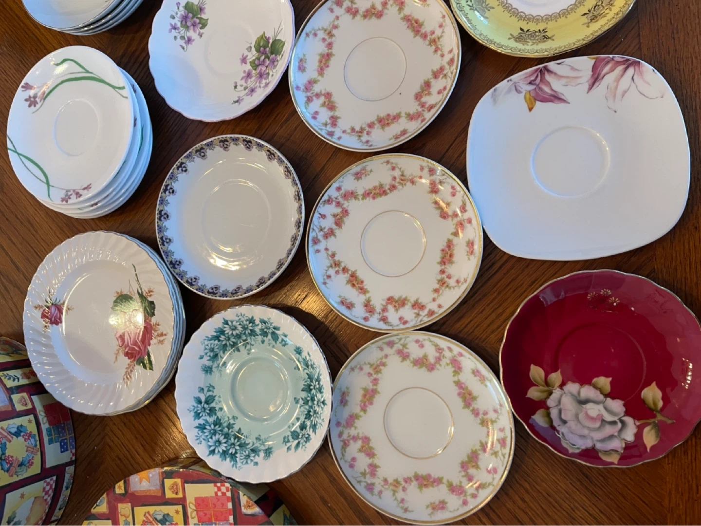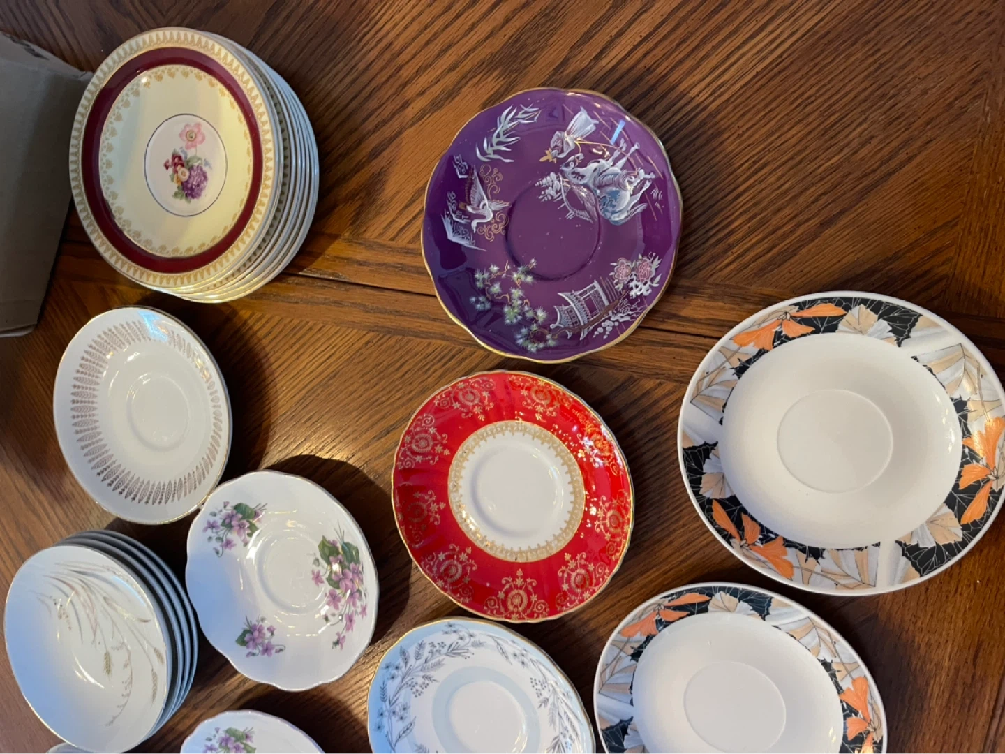 A collection of assorted decorative saucers with various floral and patterned designs. Includes a stack of cream-coloured saucers with a maroon and gold rim. Also features individual saucers with detailed floral motifs and a unique purple design.