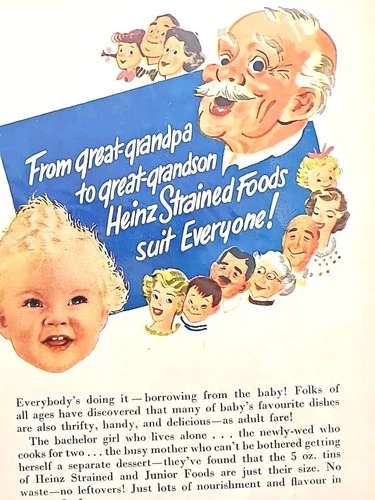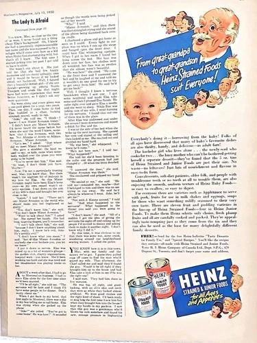 Ad 1: “From Great-Grandpa to Great-Grandson Heinz Strained Foods Suit Everyone!” — full-color ad, dated July 15, 1950, Woman’s Magazine.
