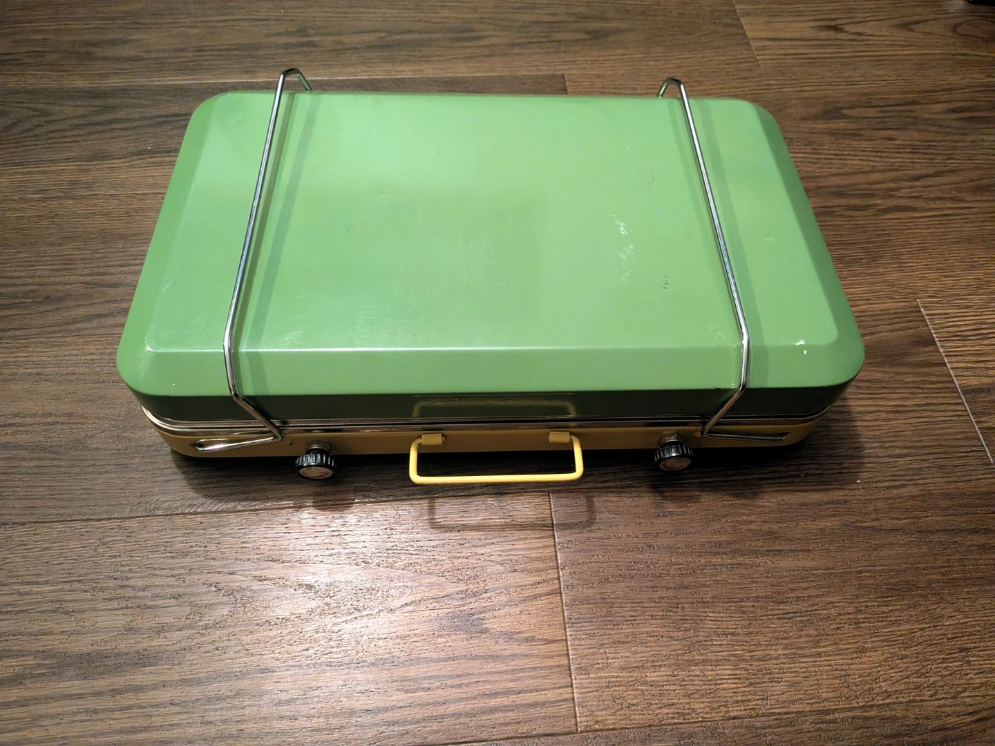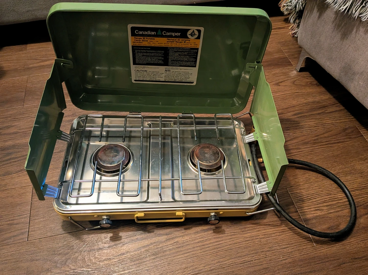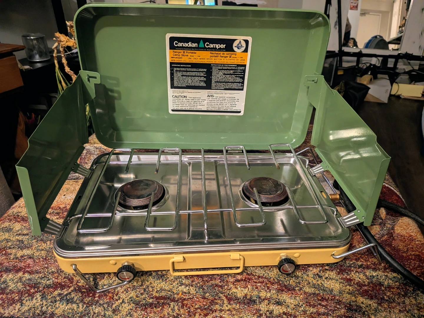 This is a Canadian Camper Ranger III portable camp stove. It features two burners and a sturdy design for outdoor cooking. The stove is yellow and green, with a metal grate. Includes original hose. (NEVER USED)