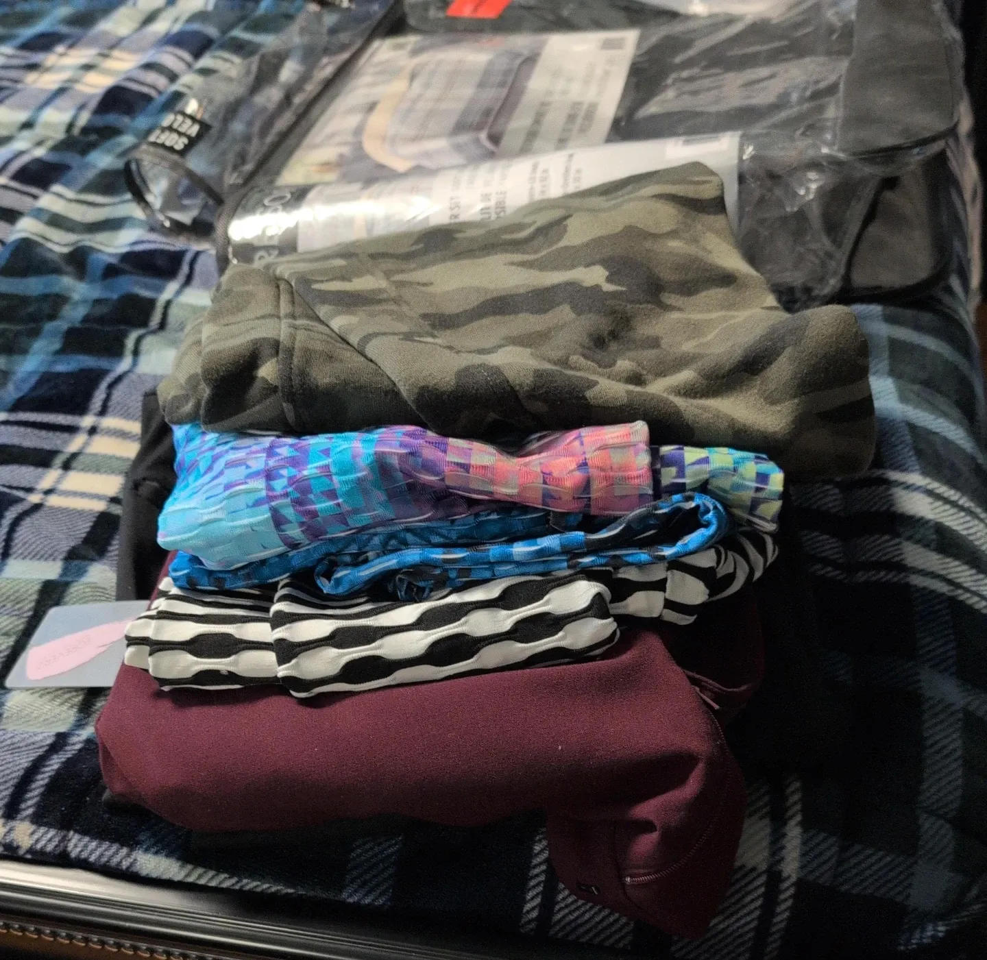 This bundle includes various athletic wear items. You'll find a camouflage print hoodie, patterned tops, and solid-coloured bottoms. Material varies by piece, offering comfort and flexibility for workouts. These pieces are great for layering or wearing on their own during active pursuits.