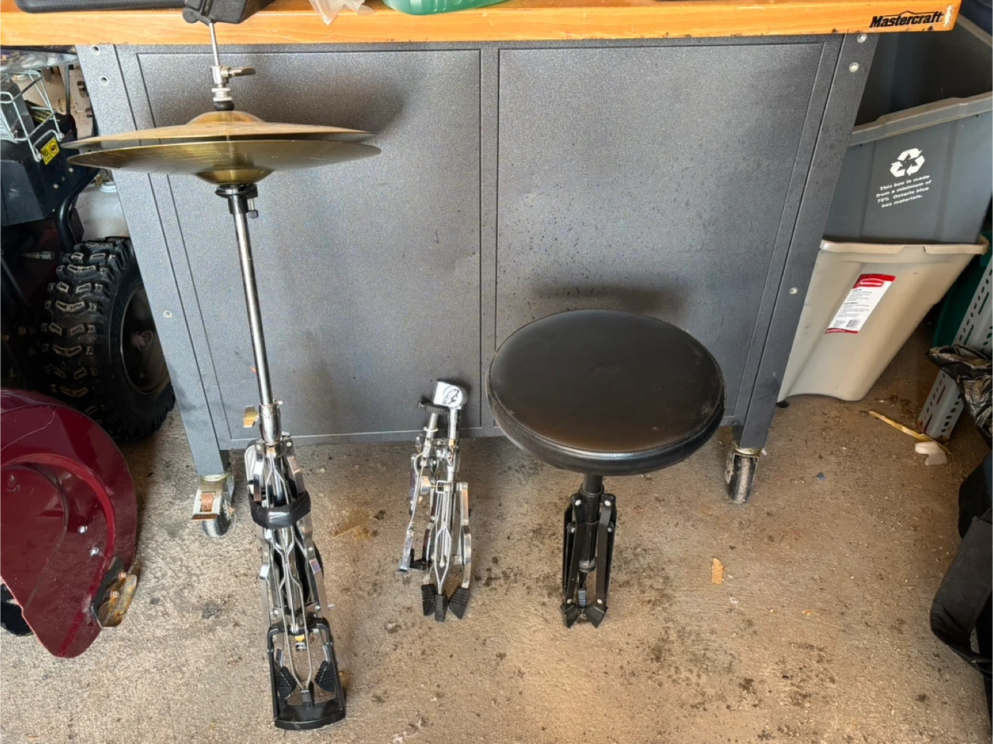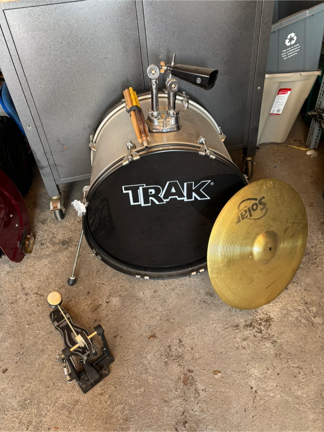 This is a Trak drum set, including several drums, a stool, and a cymbal stand. It comes with drumsticks and a cowbell accessory. Great for aspiring drummers or practice sessions!