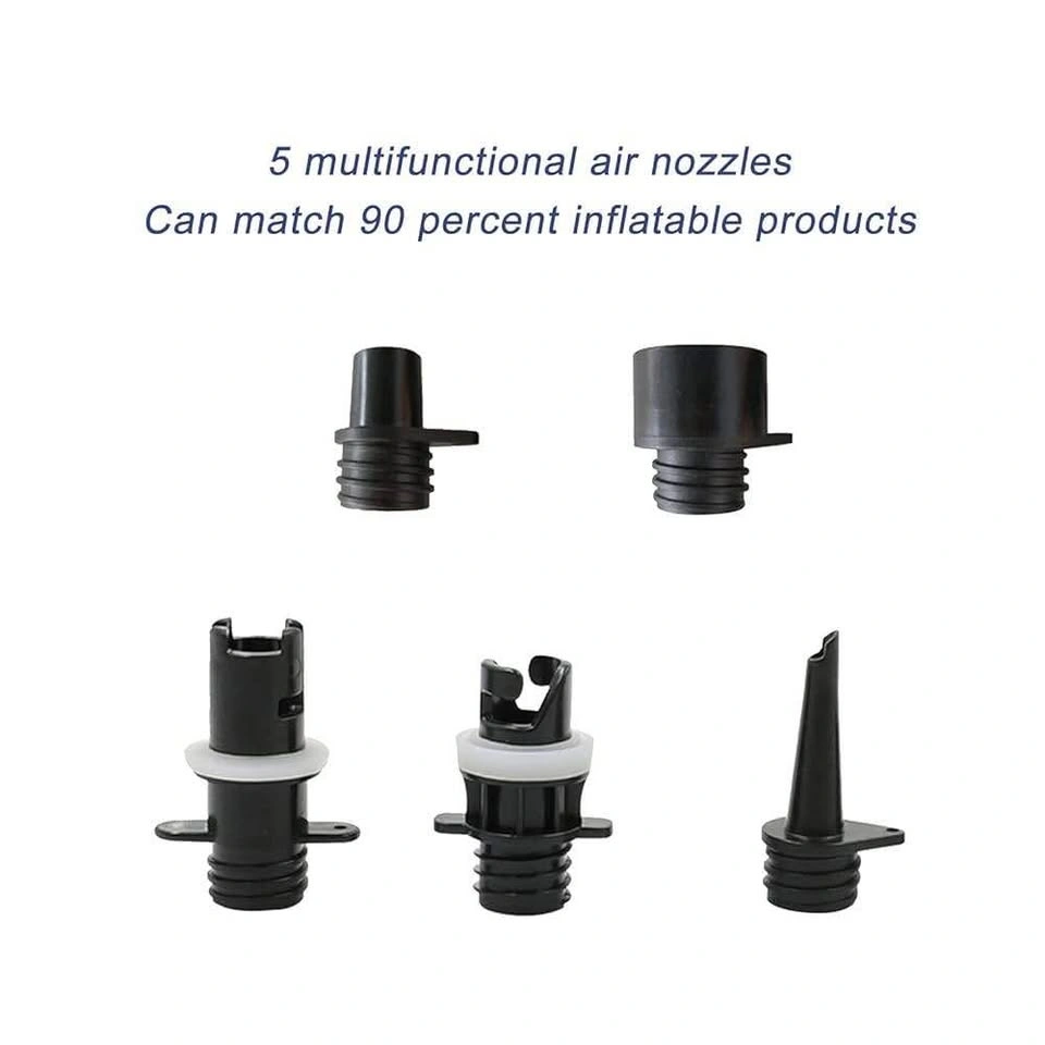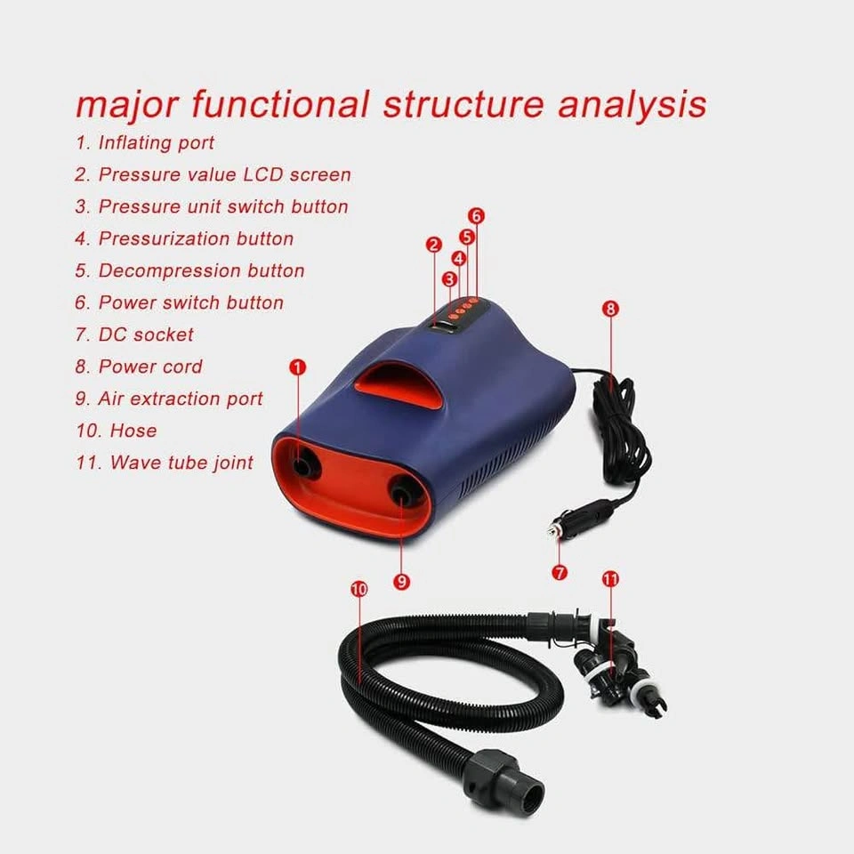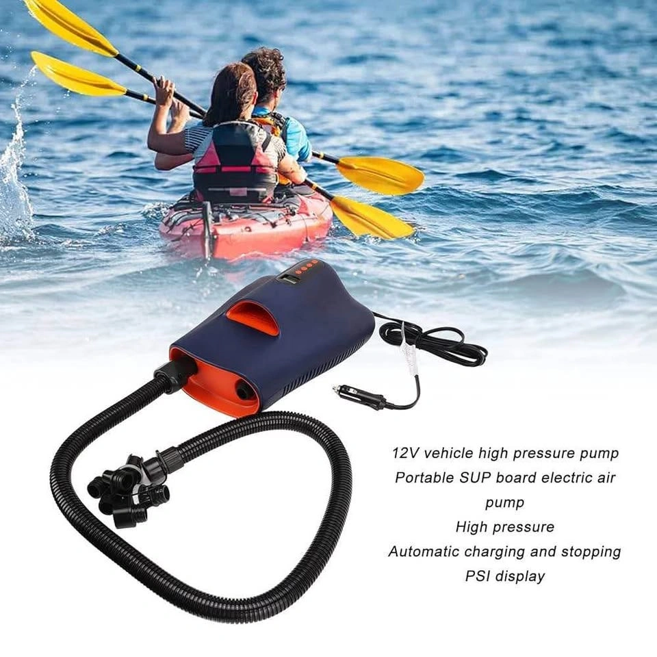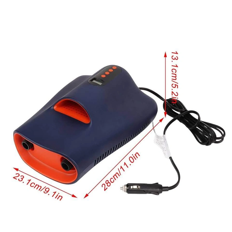 15etship SUP electric pump with active cooling system up to 22PSI high pressure, ideal for use on high-pressure inflatables. Can inflate and deflate SUPs, tents, and other inflatables quickly. Automatic dual stage pump with 110W Large Power. There are 2 stages, with max speeds of 350L/min and 70L/min. Auto-off function turns the pump off when target pressure is reached when inflating or deflating. Adjustable 0-22 PSI clearly visible on the LCD display. Use the digital display to pre-set your desired pressure value and monitor the pressure in real time. The fully automatic operation makes inflating or deflating a breeze. Comes with a 12V DC plug which works easily by connecting with your car’s cigarette lighter. Comes with a full set of 6 different size nozzles to fit most high pressure inflatables. Ergonomic portable handle design, which is easy to carry and intelligent to use. Durable quality and eco-friendly material.