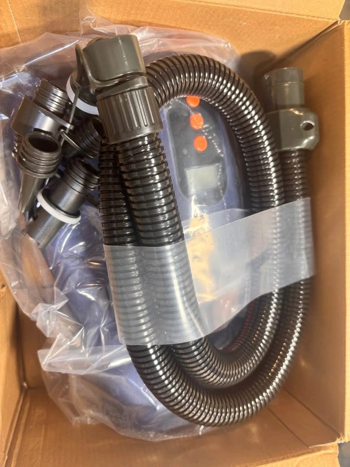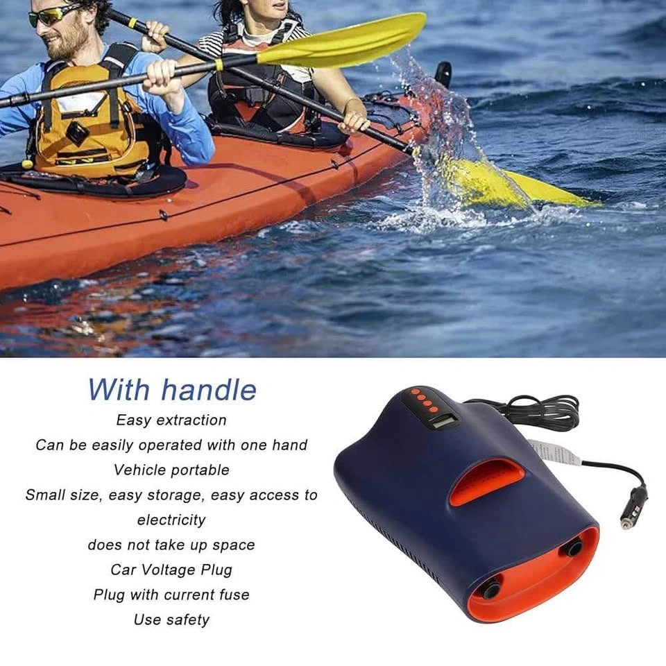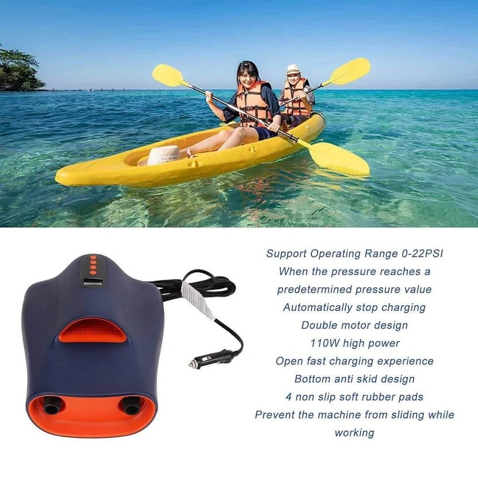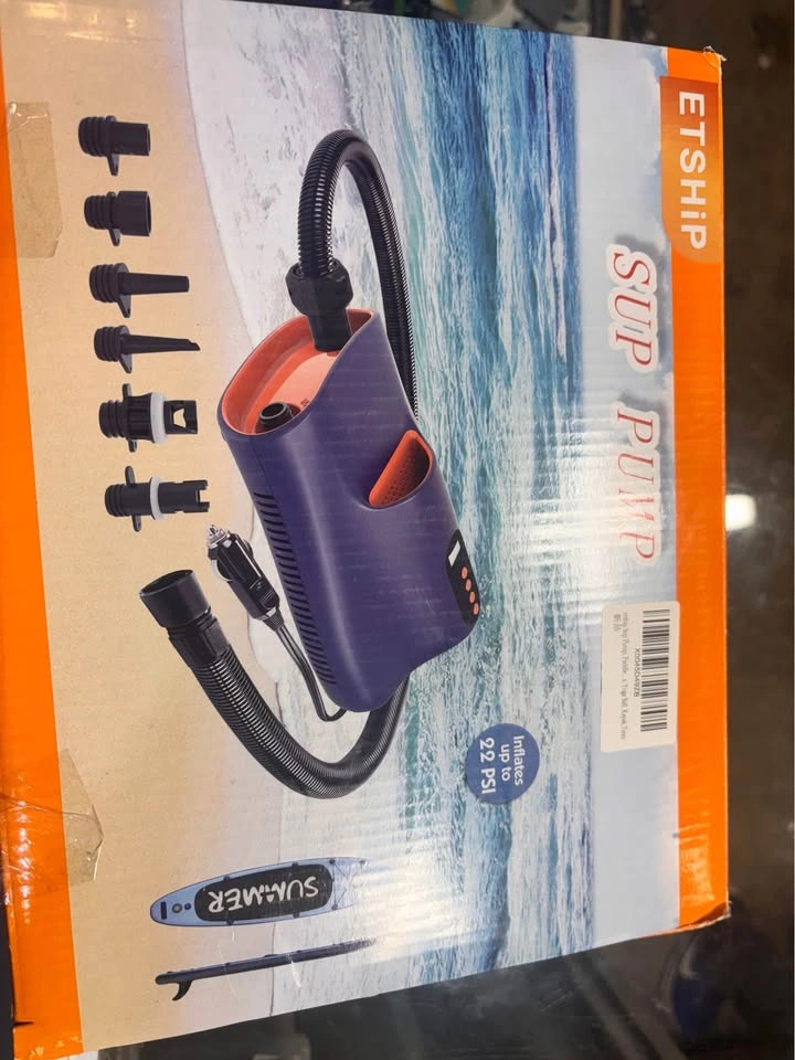 15etship SUP electric pump with active cooling system up to 22PSI high pressure, ideal for use on high-pressure inflatables. Can inflate and deflate SUPs, tents, and other inflatables quickly. Automatic dual stage pump with 110W Large Power. There are 2 stages, with max speeds of 350L/min and 70L/min. Auto-off function turns the pump off when target pressure is reached when inflating or deflating. Adjustable 0-22 PSI clearly visible on the LCD display. Use the digital display to pre-set your desired pressure value and monitor the pressure in real time. The fully automatic operation makes inflating or deflating a breeze. Comes with a 12V DC plug which works easily by connecting with your car’s cigarette lighter. Comes with a full set of 6 different size nozzles to fit most high pressure inflatables. Ergonomic portable handle design, which is easy to carry and intelligent to use. Durable quality and eco-friendly material.