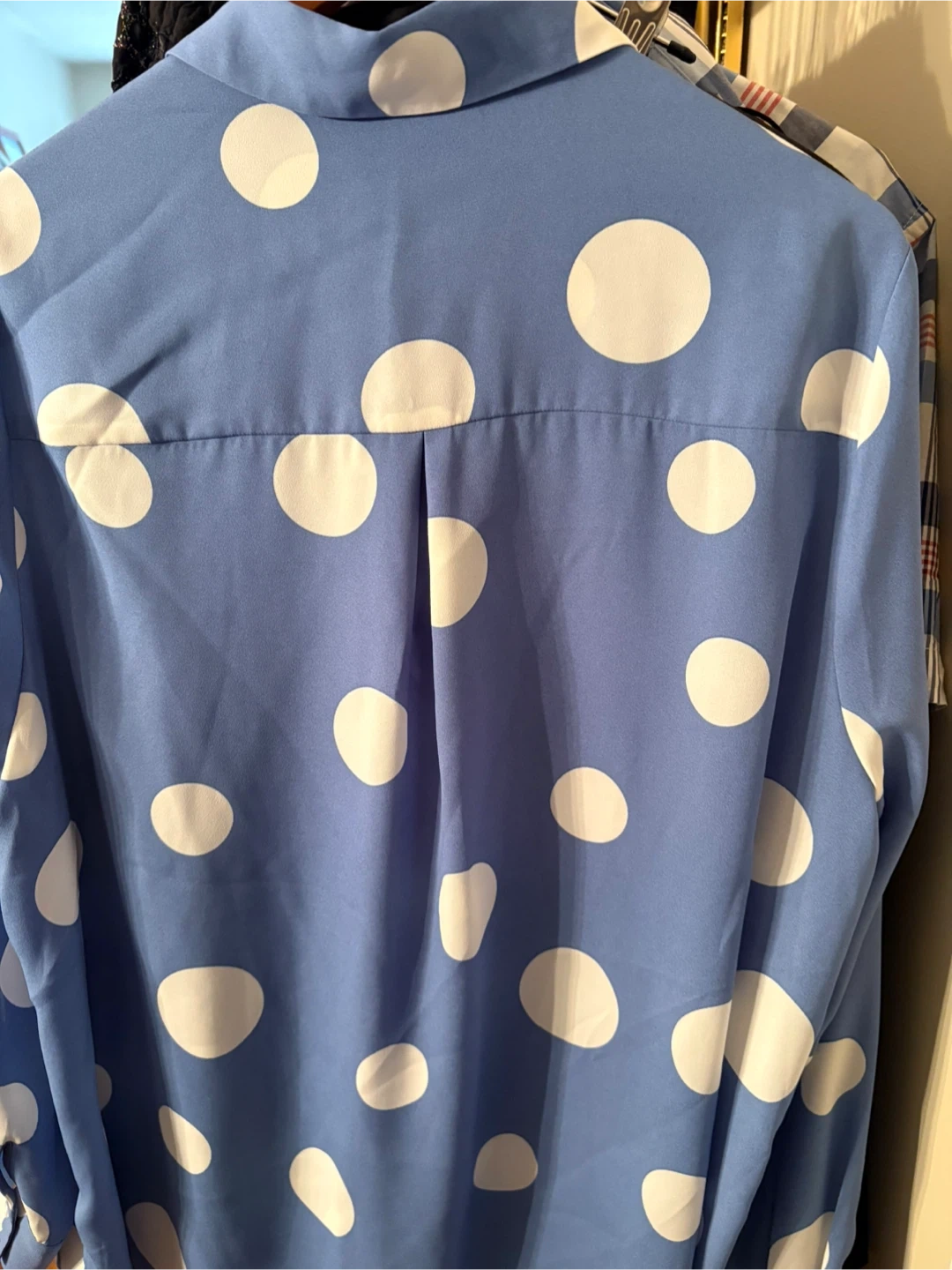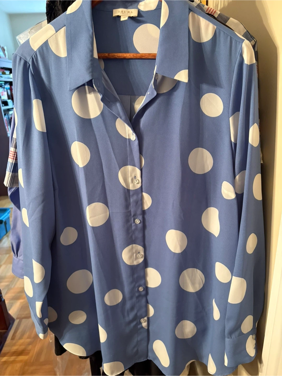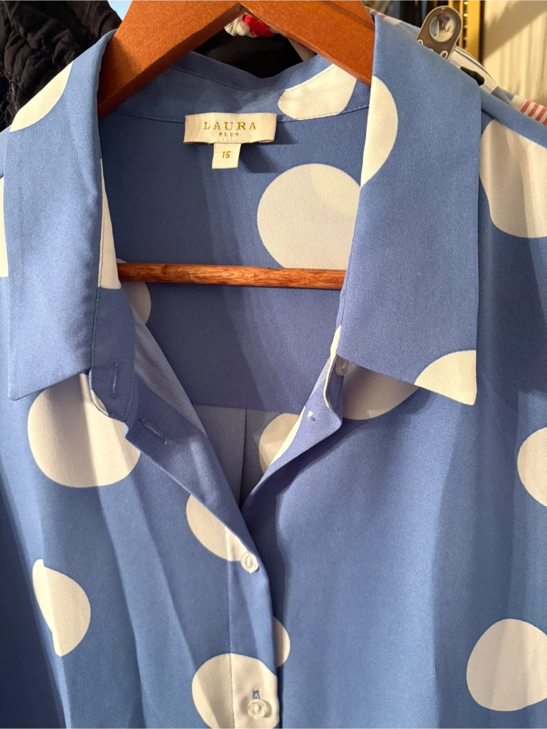 Laura long-sleeved blouse in a blue and white polka dot pattern. It's a size 16. This top would be nice for adding a pop of fun to your wardrobe! Never worn. measures 30in from shoulder to bottom of blouse.