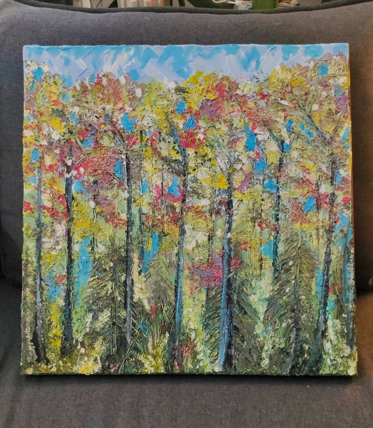 This is a textured painting depicting a vibrant forest scene. It features an impasto style with thick application of paint, giving it a rich, tactile quality. The piece showcases a colourful array of trees against a bright blue sky.