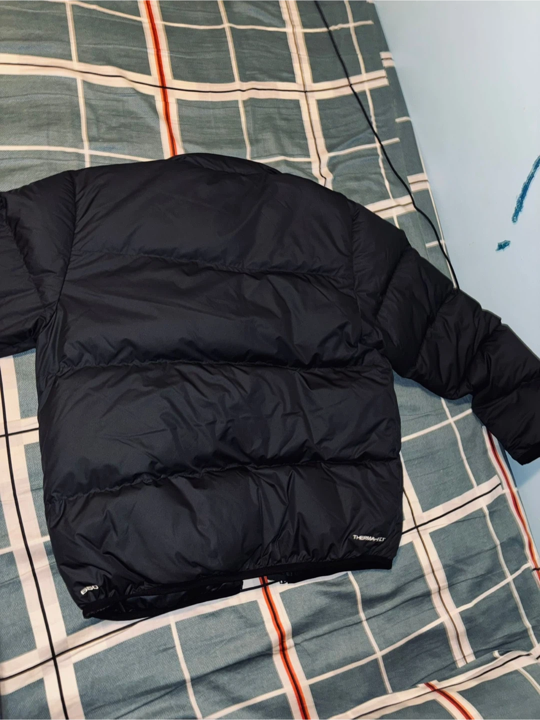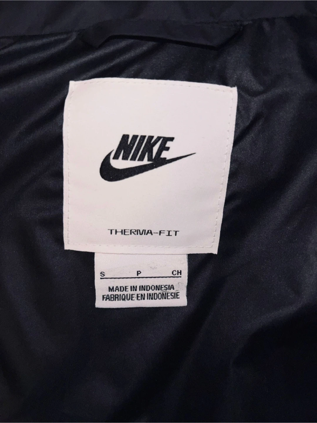 Black Nike Therma-FIT puffer jacket. It's a size S and made in Indonesia. This jacket provides excellent warmth for cooler days!