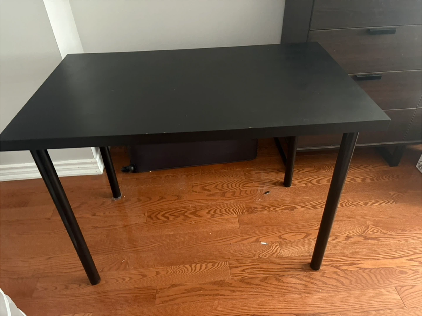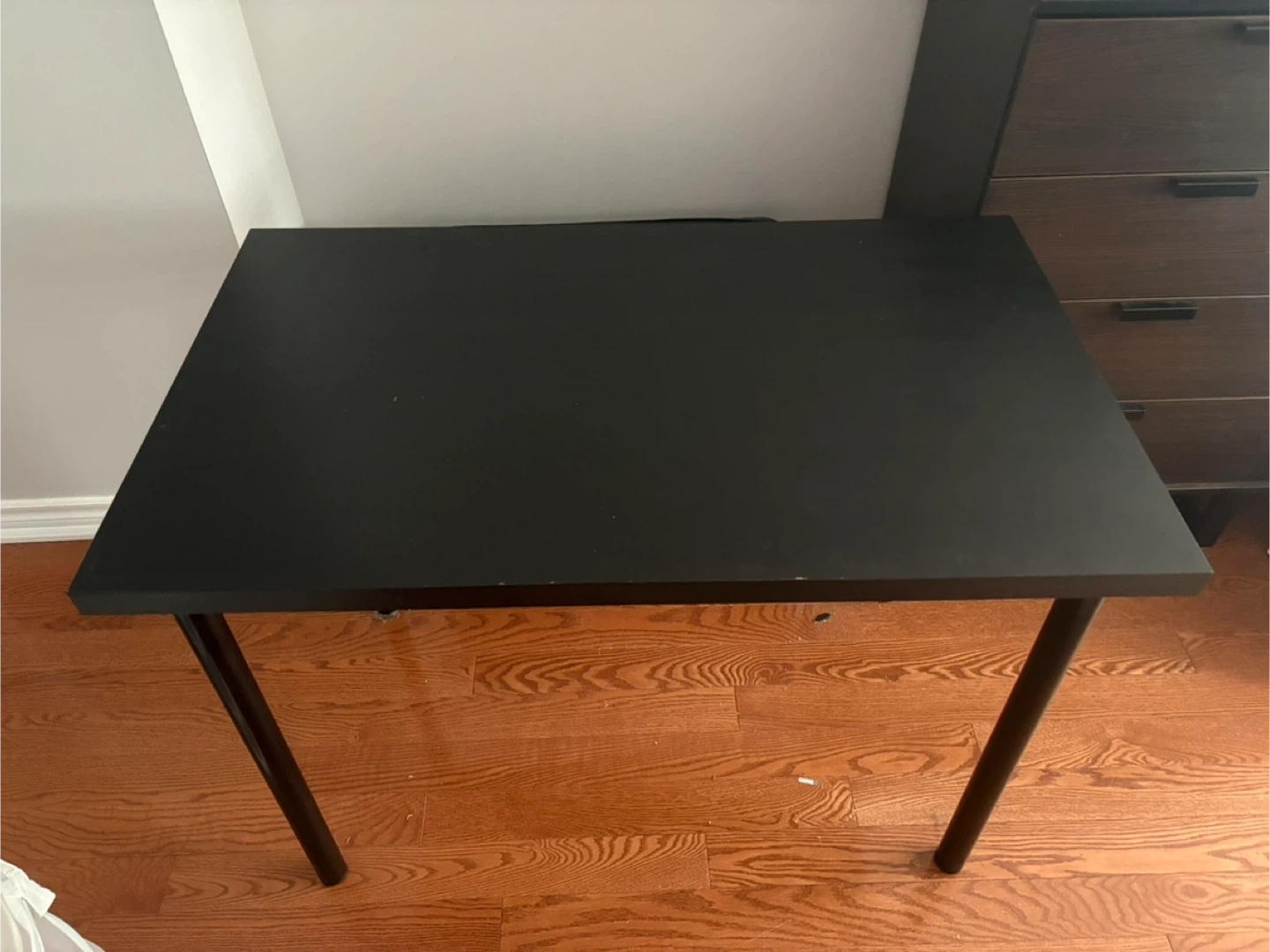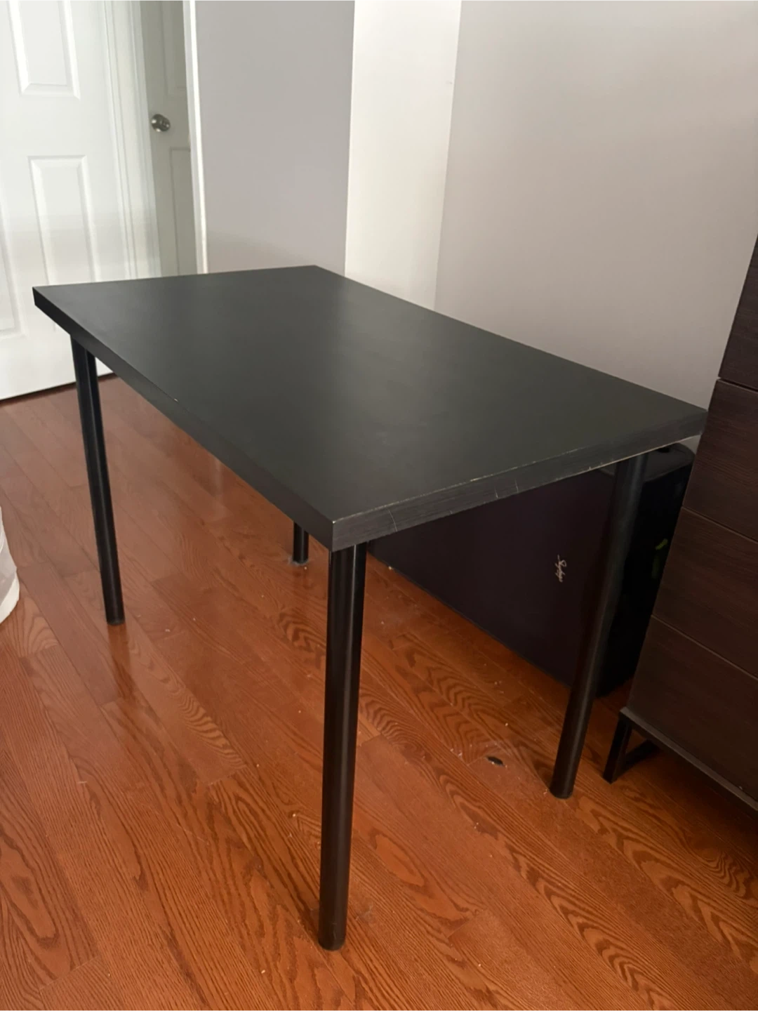 This is a black desk table from IKEA. It has a simple design with four metal legs. It's great for a home office or study space.