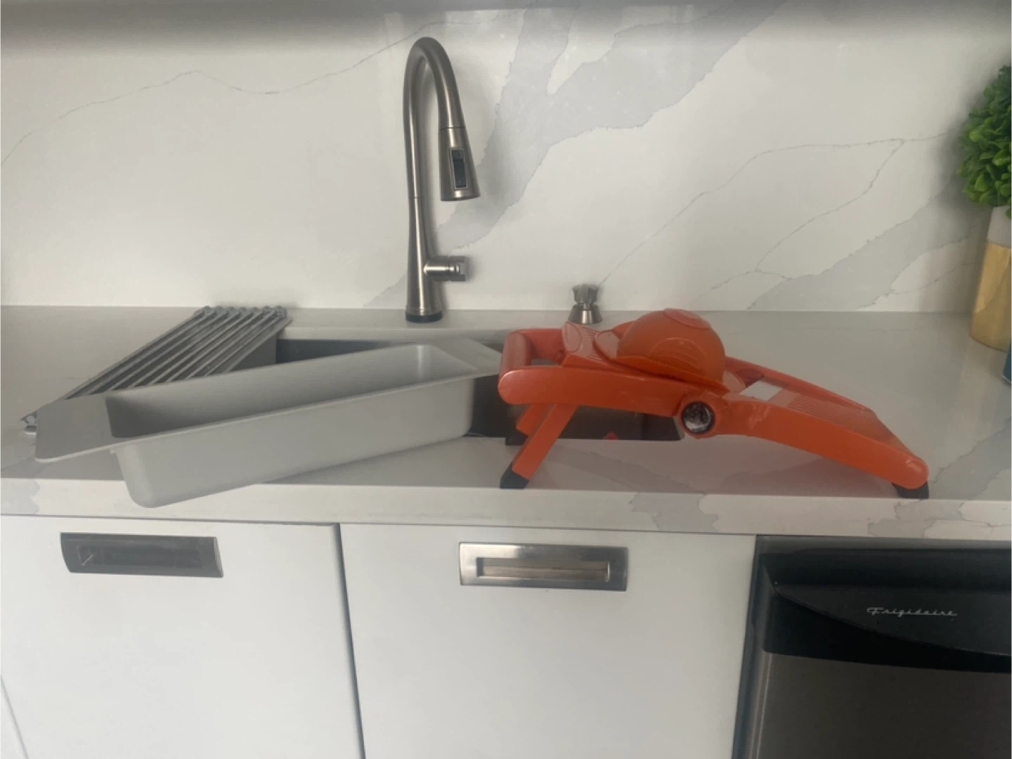 This two-piece kitchen tool includes an orange slicer and a grey collection bin. It's made of plastic and designed for slicing vegetables. The slicer has adjustable blades for different thicknesses. Useful for meal prep!