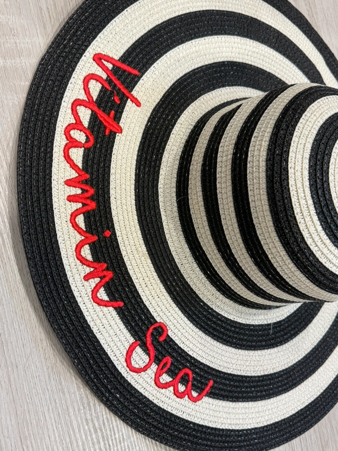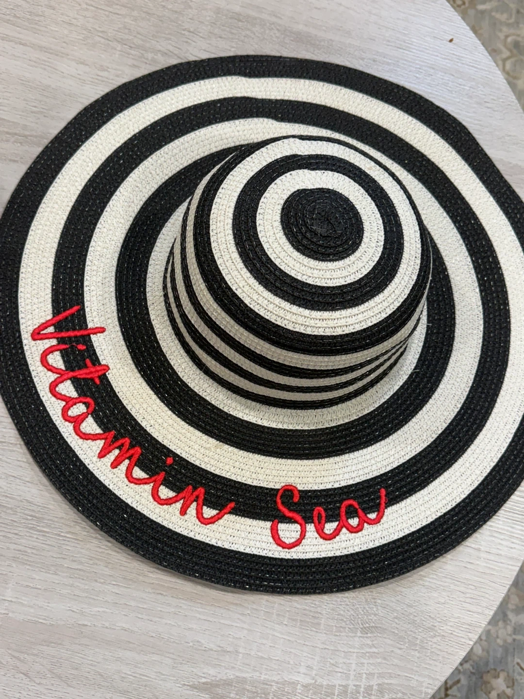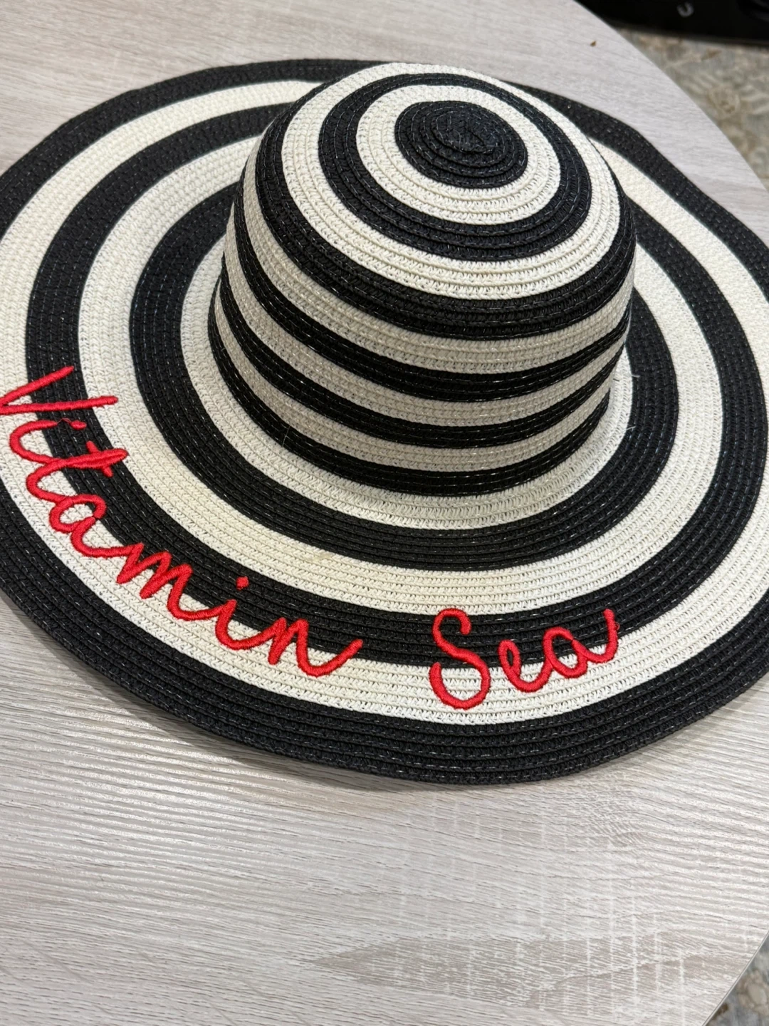 This wide-brimmed straw hat features a classic black and white stripe pattern. It has "Vitamin Sea" embroidered in red script on the brim. Great for sun protection at the beach or pool!