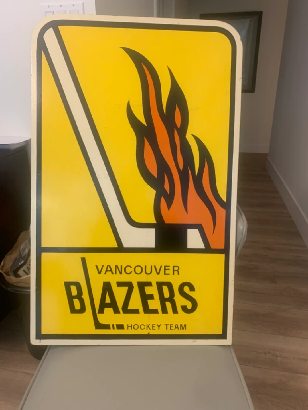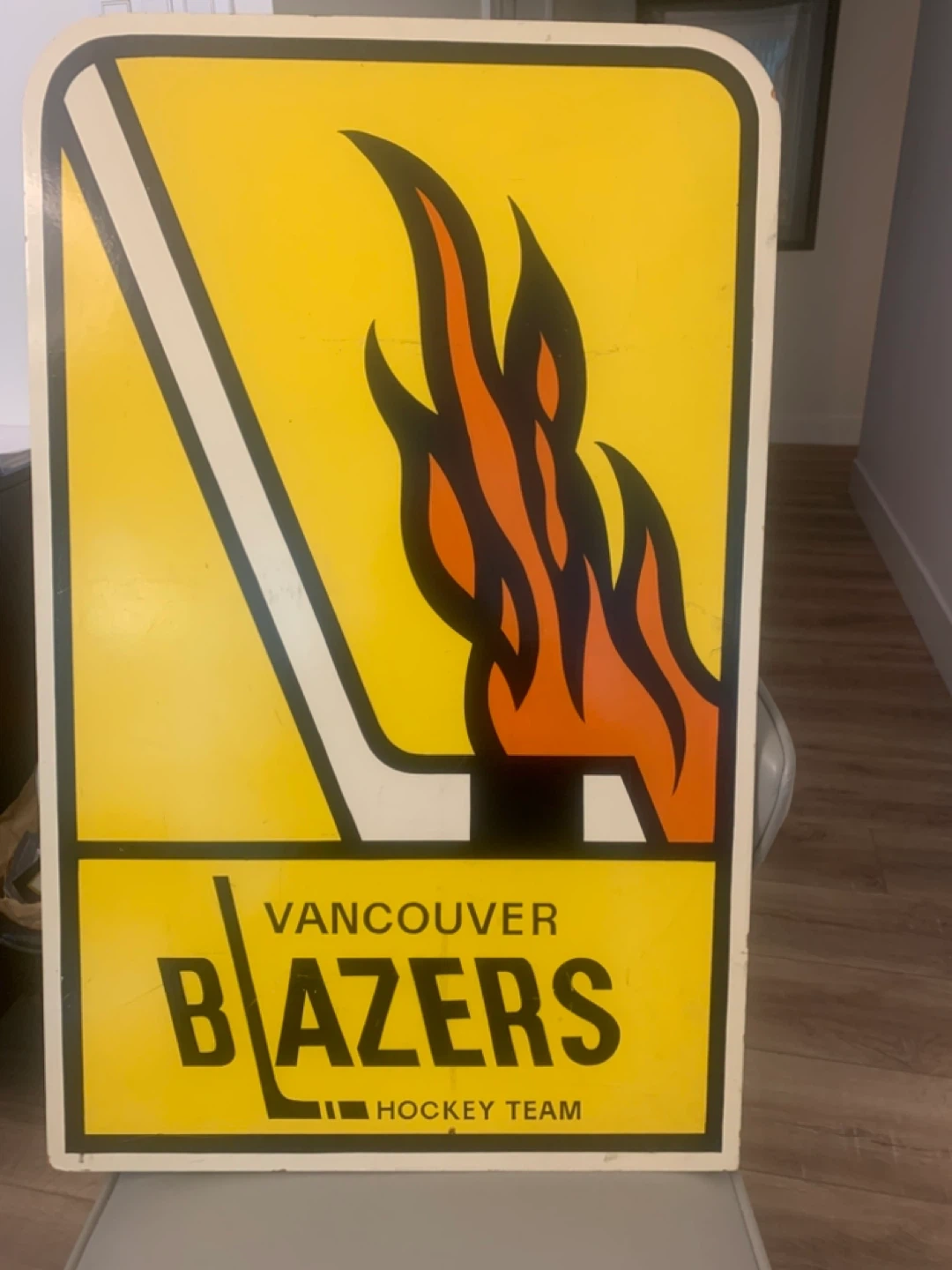 Vintage Vancouver Blazers Hockey Team sign. Features the team's iconic logo with flames and a hockey stick. A great piece for any fan's collection! Approximately 30”h —18”w Was in Andy Bathgates office