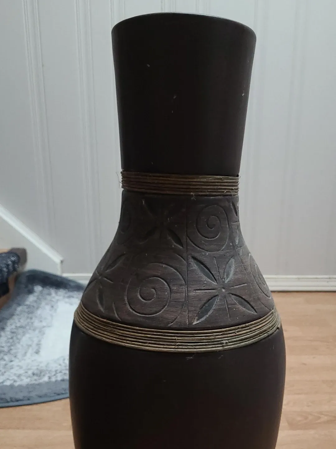 Selling a decorative vase. It's brown with a carved design around the middle and wrapped with twine. It would make a great addition to any room!
