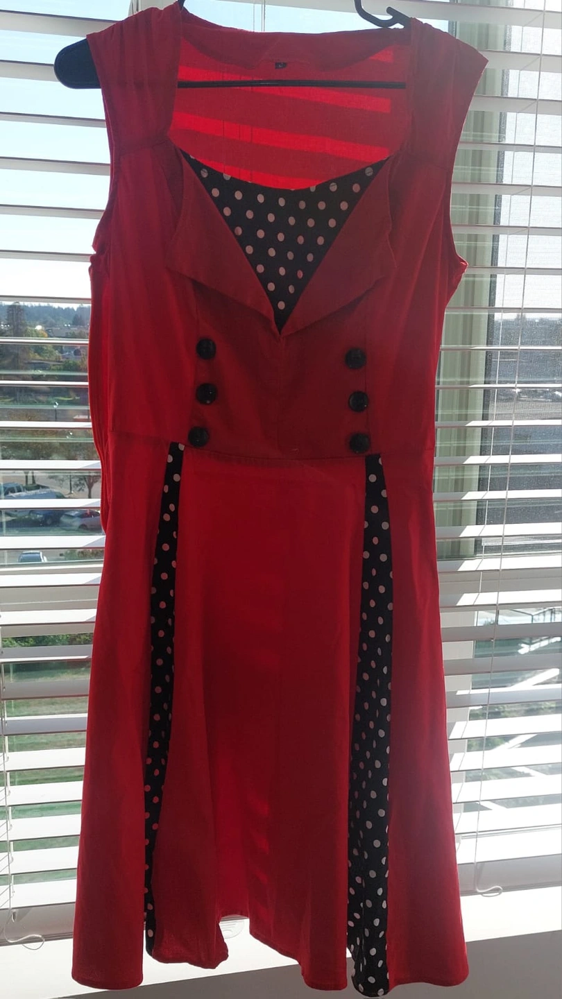 +A red sleeveless dress with black polka dot accents. The dress is a fit and flare style with a square neckline. Has a side zipper helps in wearing it