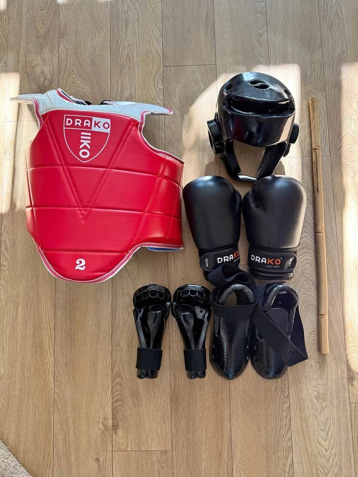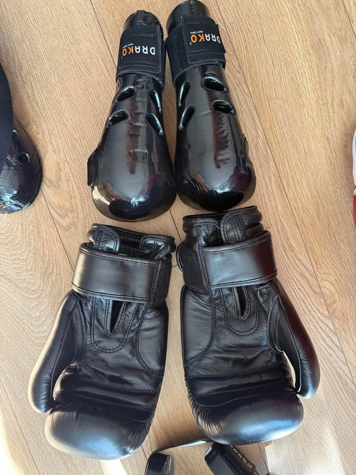 EUC Youth sparring gear. My son wore this maybe 6 times. Cleaned and sanitized. He was around 8/9 when this was used. The stickers came off on most of them so not 100% sure on sizes of the gloves or footwear. The helmet is a youth medium. Paid around $200 for this package. Great condition