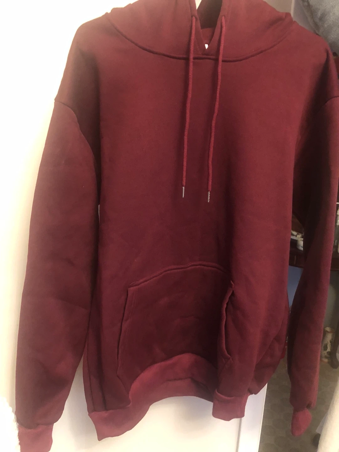 This maroon pullover hoodie is made of a soft, comfortable material. It features a drawstring hood and a front kangaroo pocket. This hoodie is a great staple for everyday wear.
