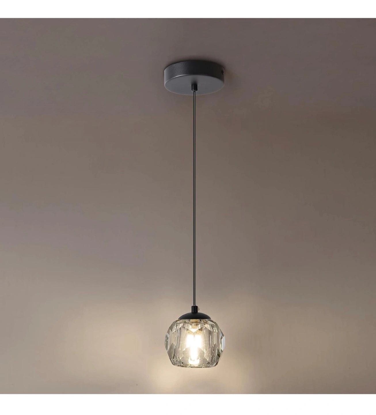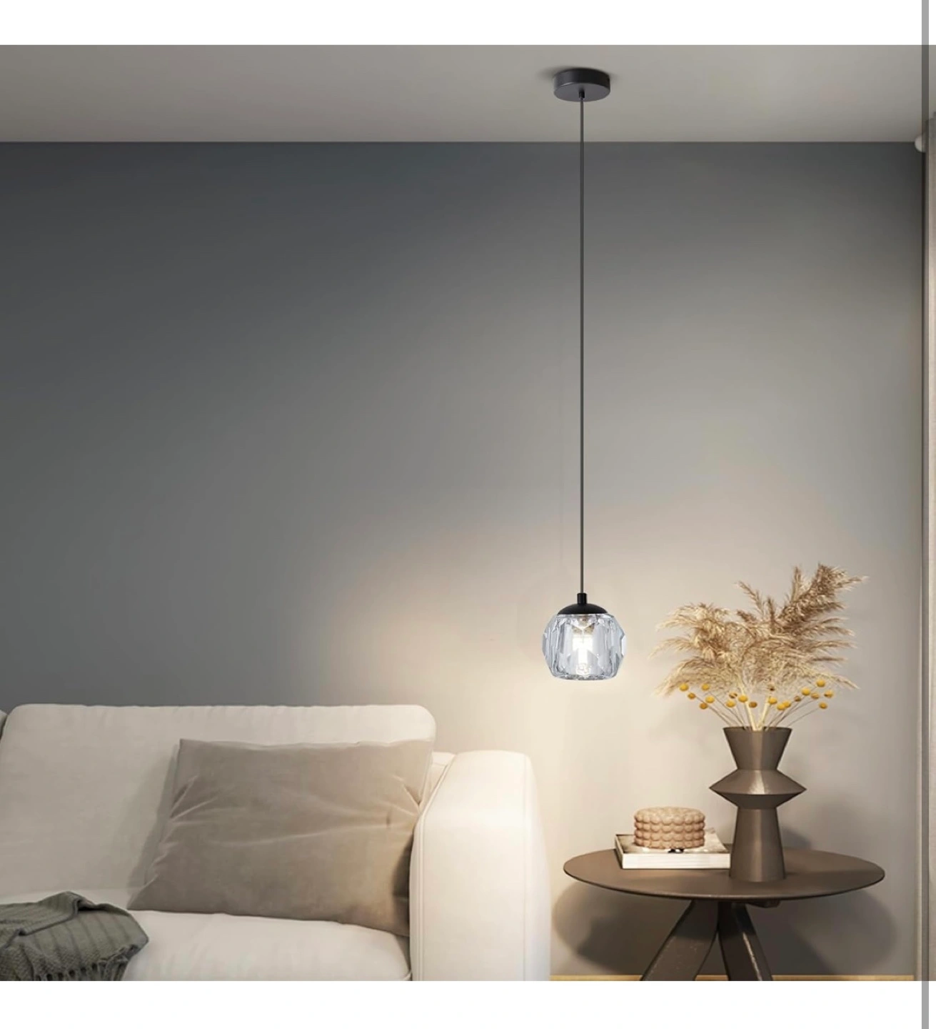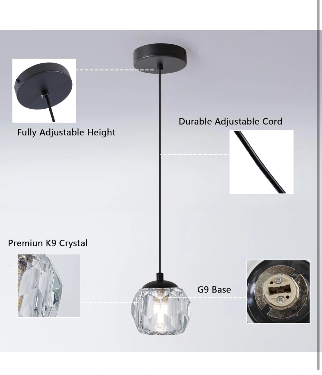 Elegant pendant light. Features a premium K9 crystal shade, adjustable height, and durable cord. G9 base. Adds a touch of modern style to any room.