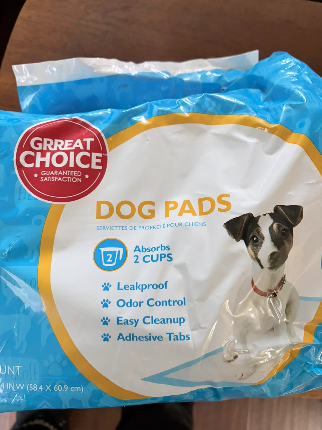 Great Choice dog pads designed for leakproof protection and odor control. They absorb up to 2 cups and feature adhesive tabs for easy placement. Cleanup is a breeze with these pads! Open bag but barely used lots of pads left