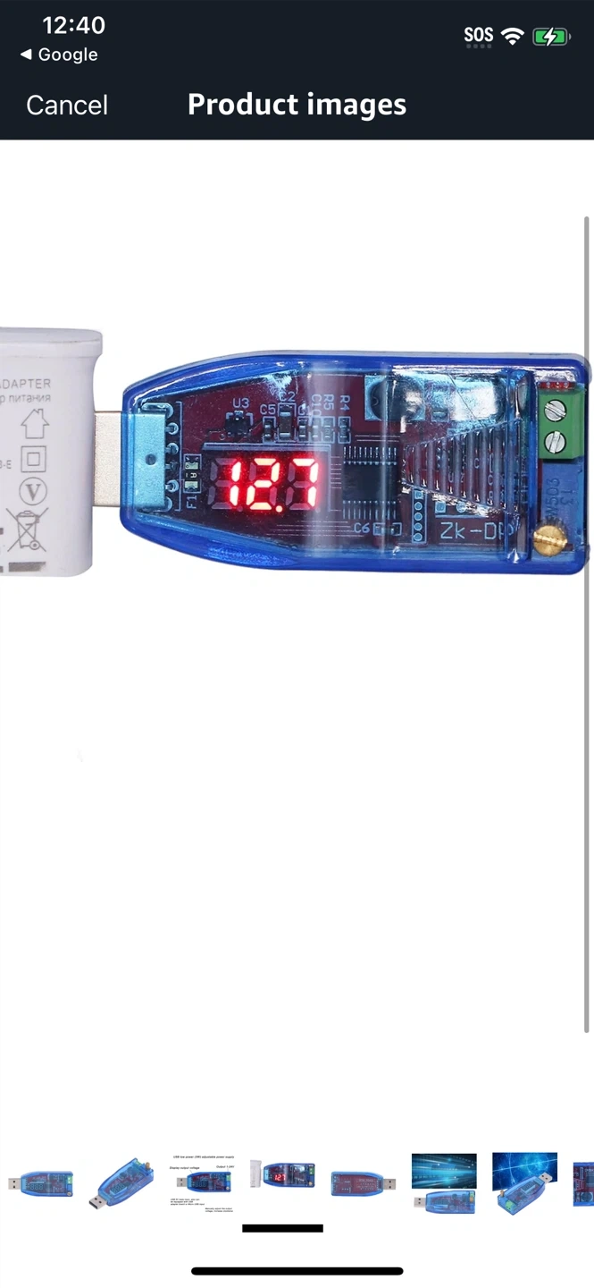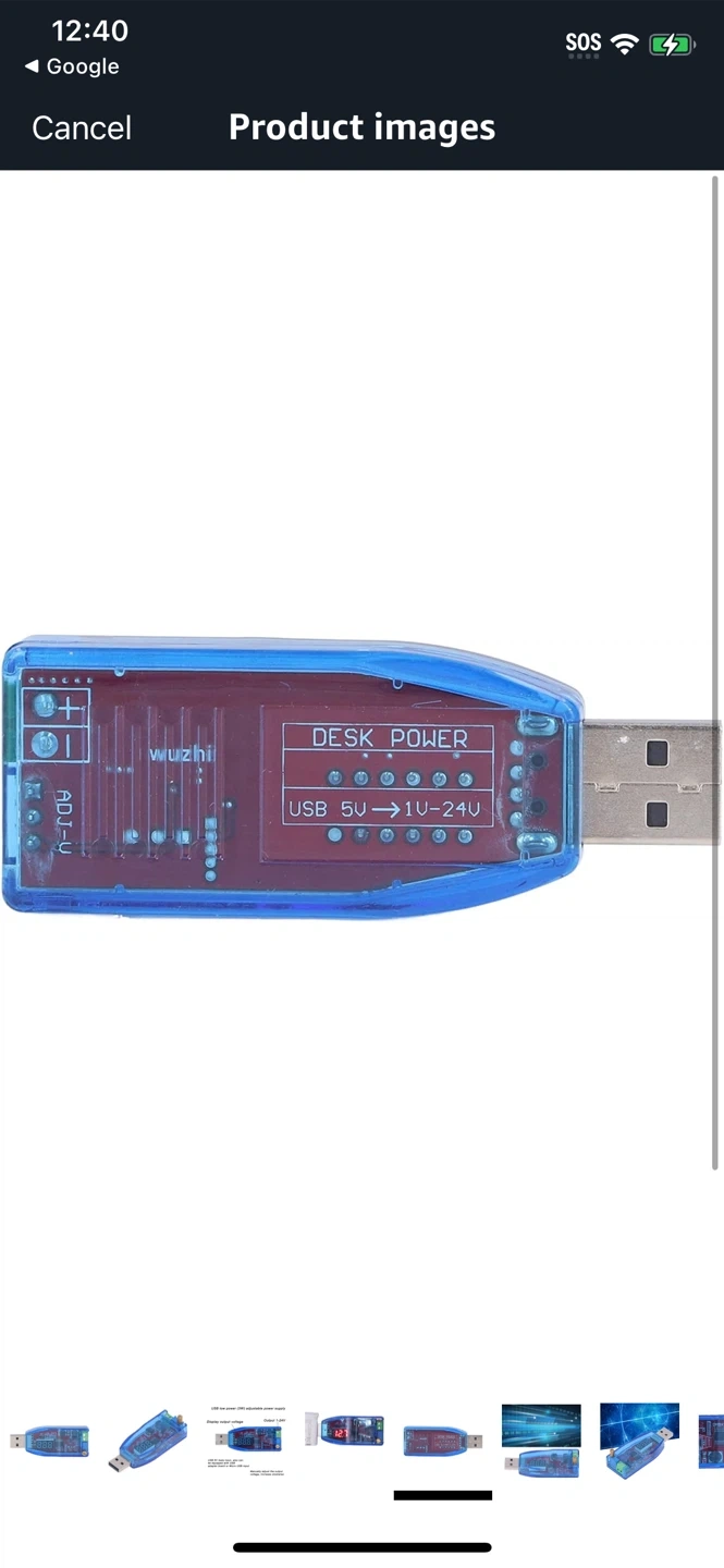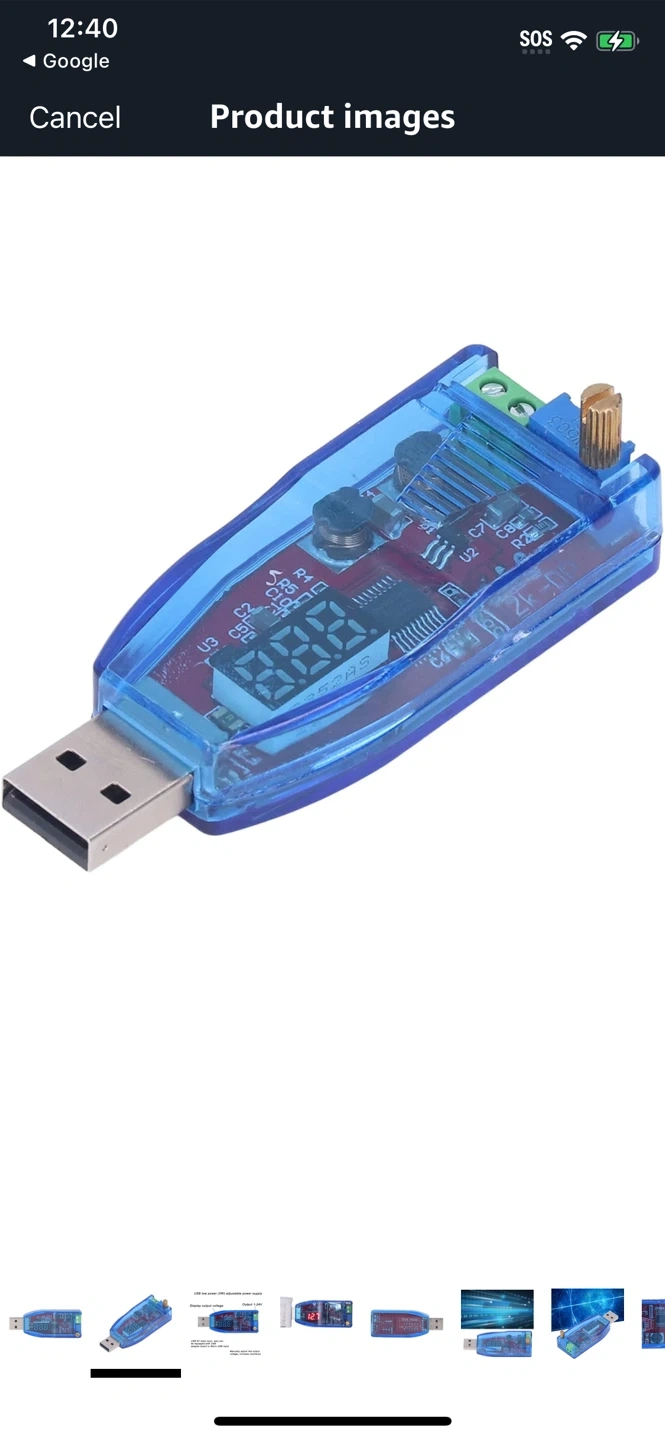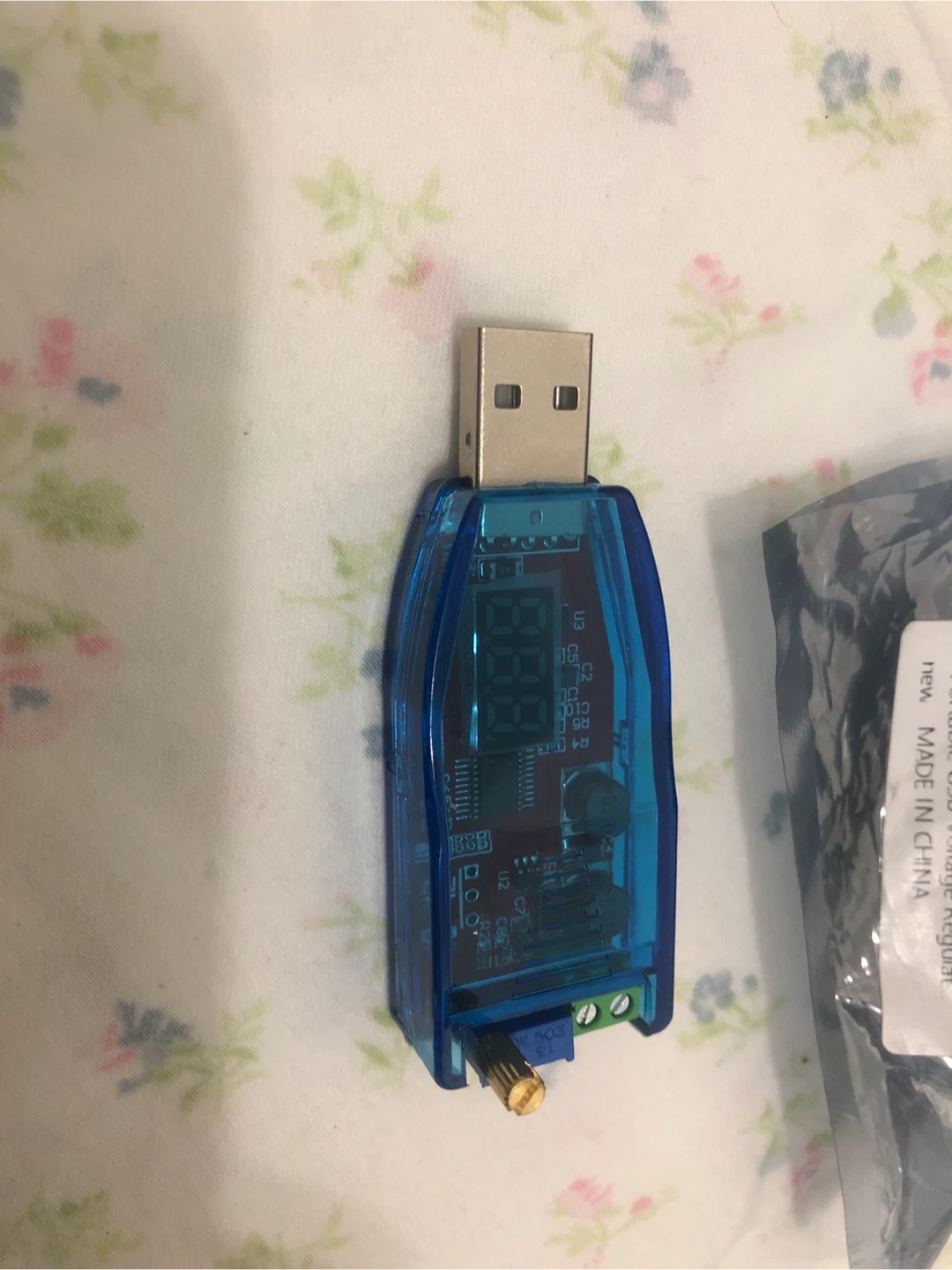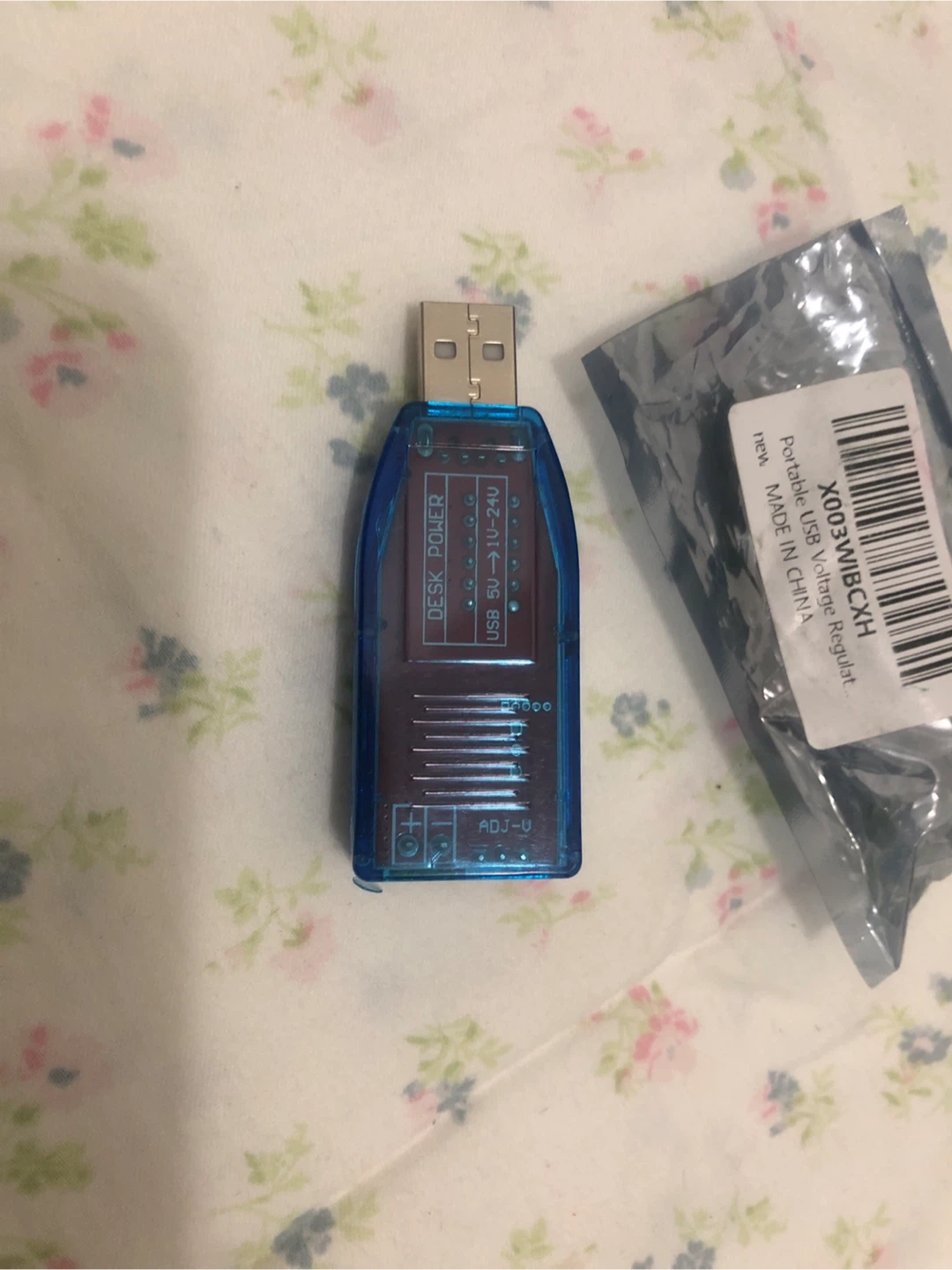 Here is a blue USB low power (3W) adjustable power supply. It features a display output voltage and an output range of 1-24V. It also has a USB 5V male input and can be equipped with a USB adapter board or Micro USB input. The output voltage can be manually adjusted by turning clockwise!