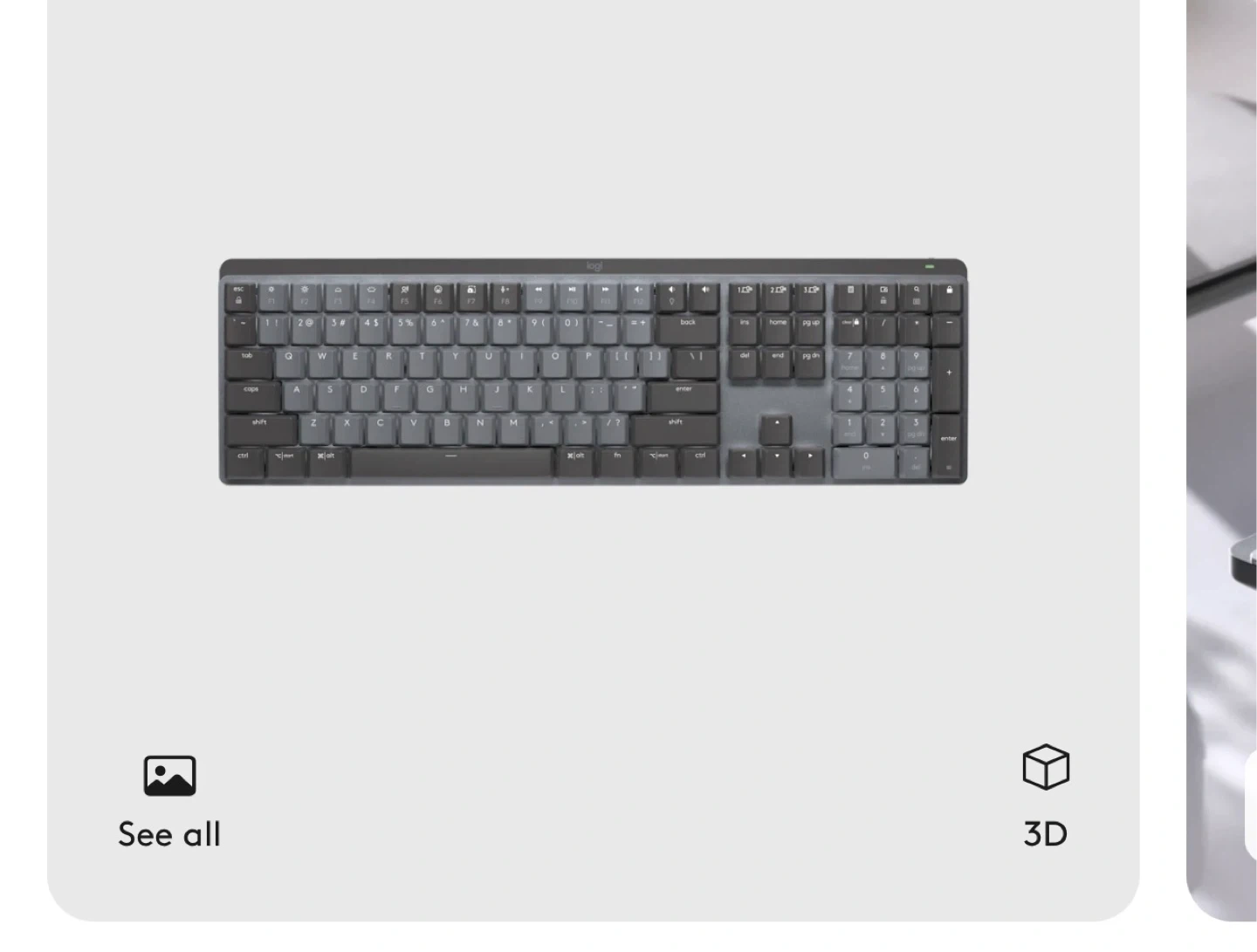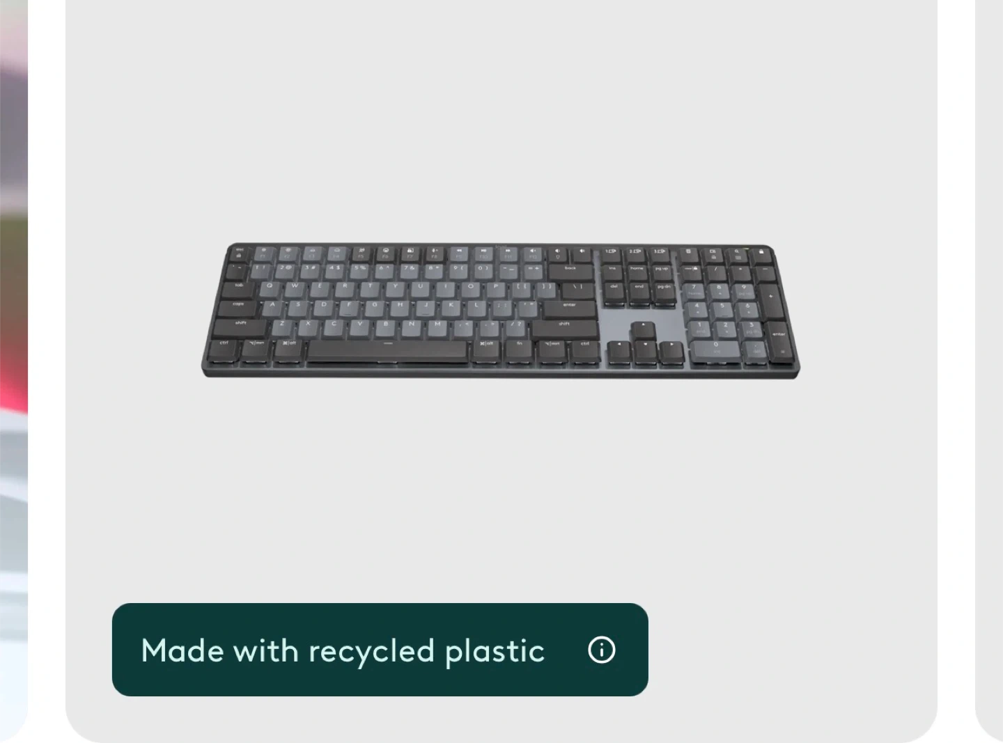 Selling a Logitech MX Mechanical Keyboard. It features tactile quiet keys for a comfortable typing experience. The keyboard is made with recycled plastic, contributing to sustainability. Enjoy low-profile keys for maximum comfort while you work or play.