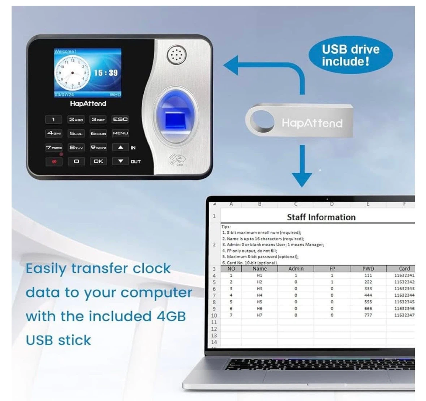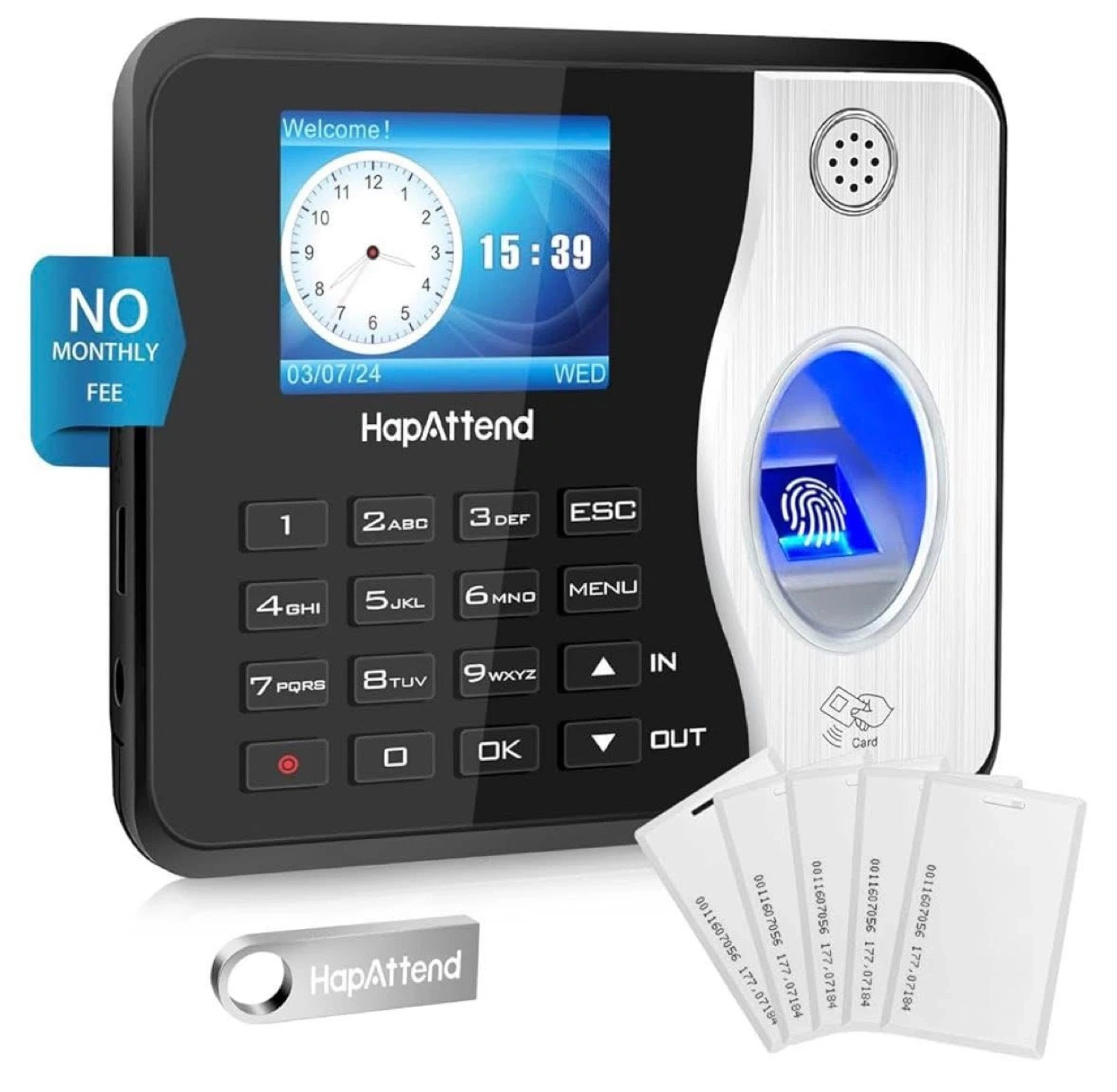Standalone Fingerprint & RFID Time Attendance System by HapAttend. It includes 5 RFID cards and a 4GB USB drive for easy data transfer. Automatic and accurate hour calculations! This system helps track employee work hours precisely.