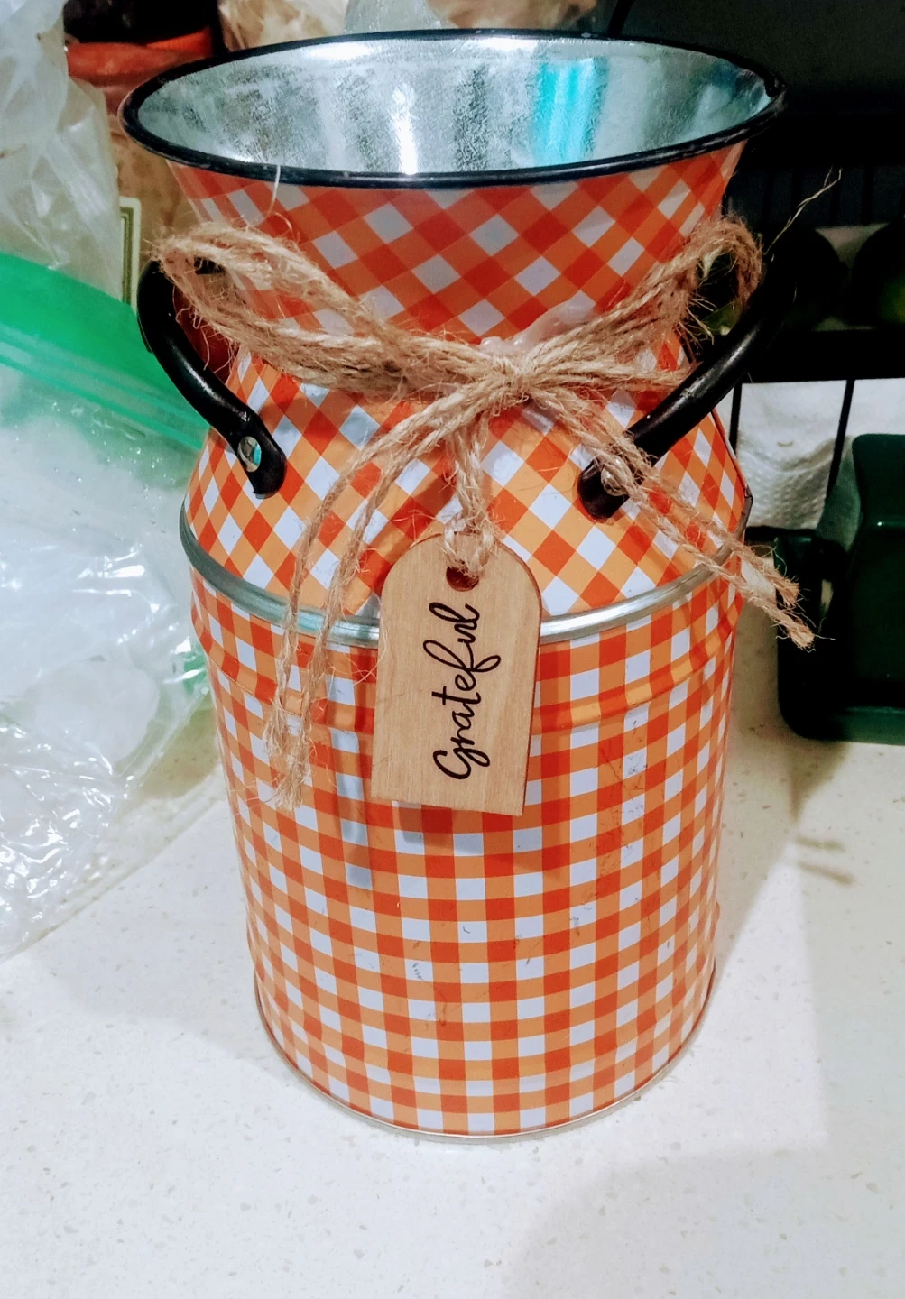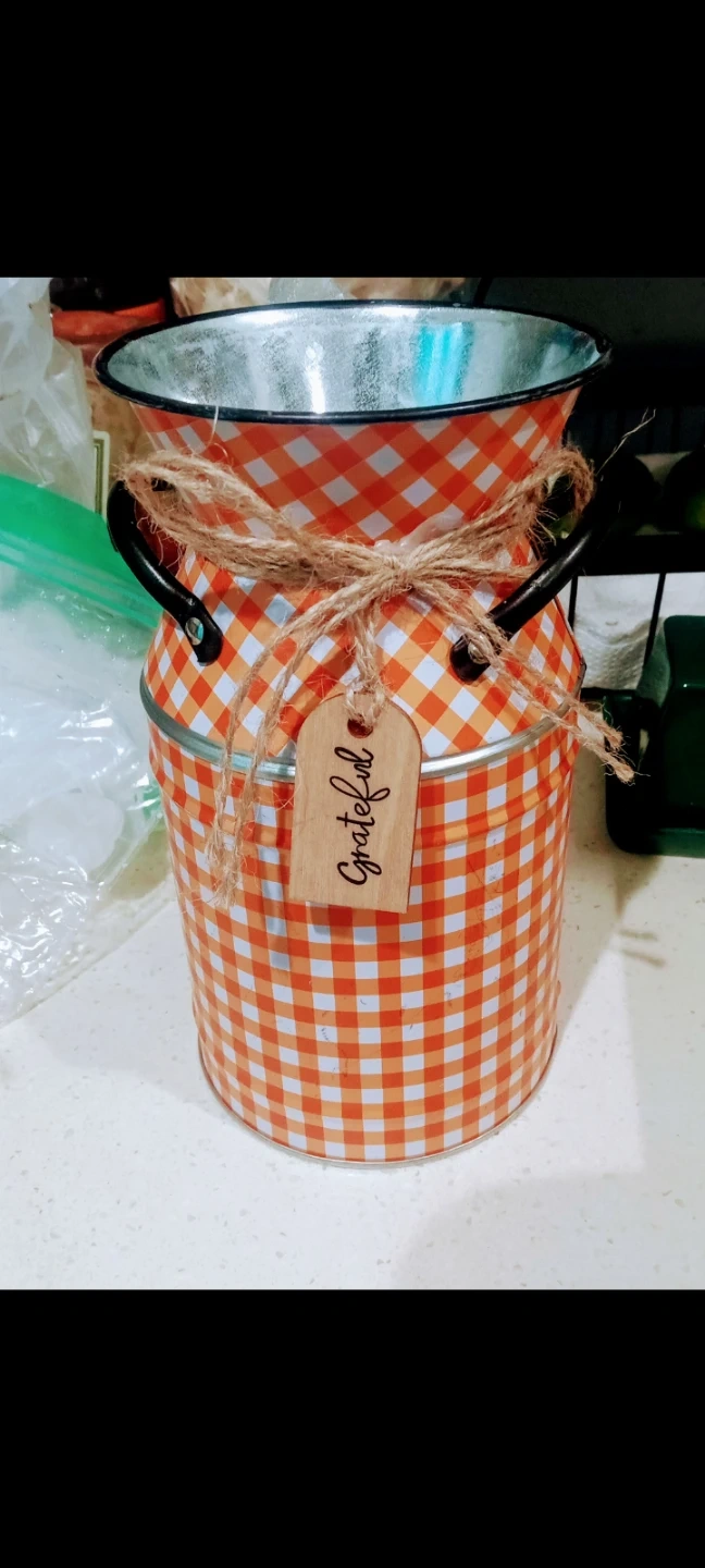 This decorative tin milk can features a cheerful orange and white gingham pattern. It has two black handles and is tied with twine, adorned with a wooden tag that says 'Grateful'. Great for fall decor!