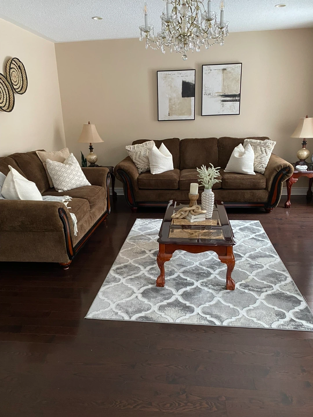 Brown wooden sofa and love seat with all cushions in the picture. Glass top on woodern coffee table. 2 side tables and 2 lamp shades. Bundle price as shown. If you want separately message me for price.