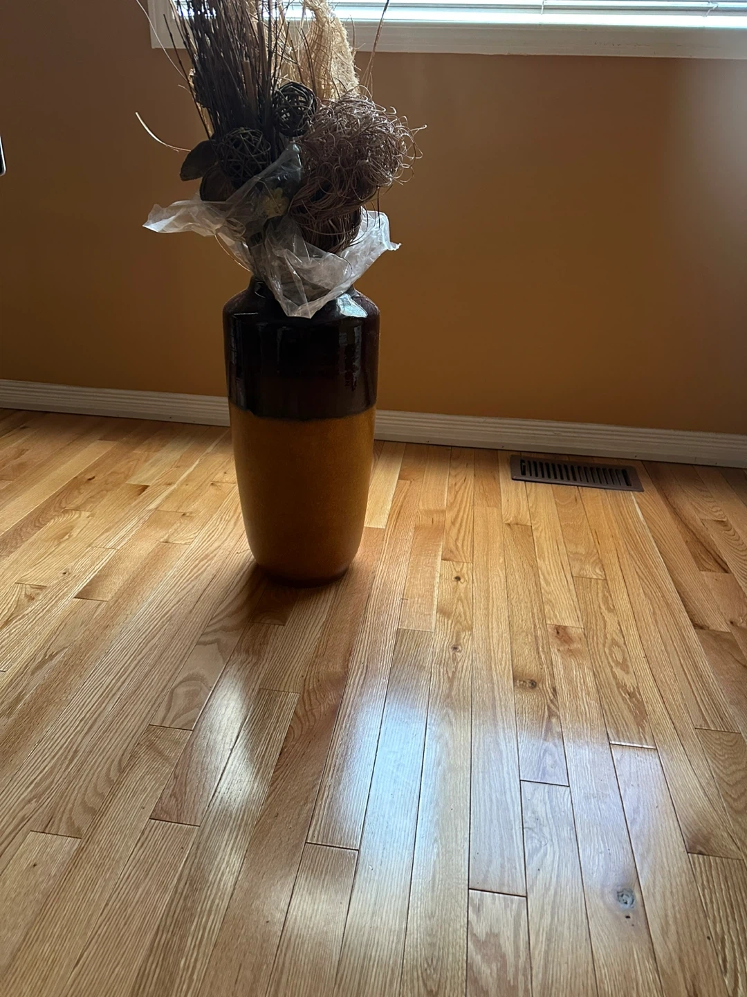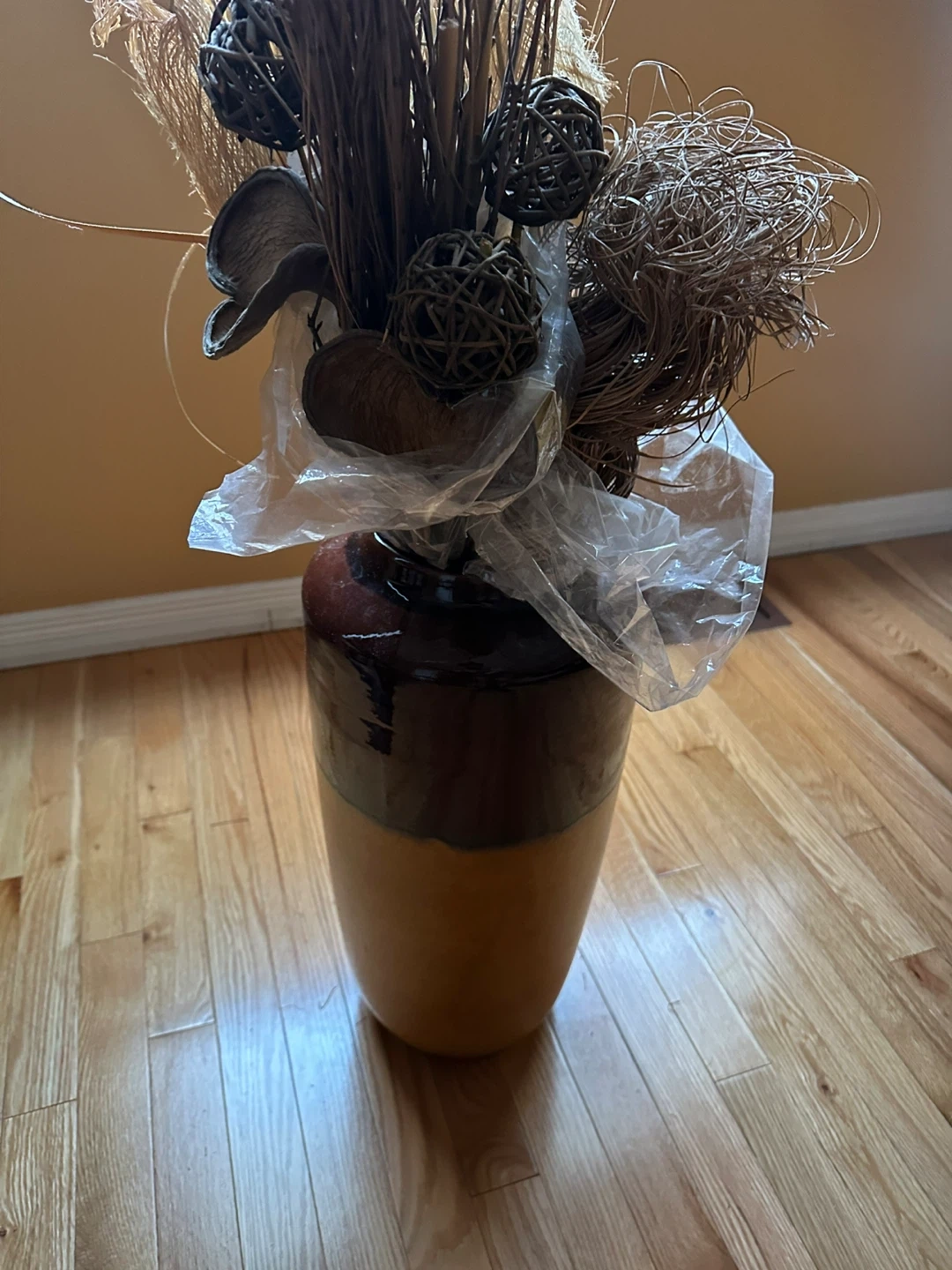 This large decorative vase is a beautiful accent piece. It features a two-tone brown and tan finish. The arrangement includes a variety of dried grasses, pods, and twigs, wrapped in plastic for transport. It's perfect for adding a rustic touch to your home decor.