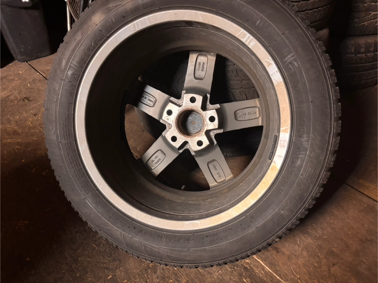 60Selling a used Euro Winter tire mounted on an alloy rim. The tire shows some wear but still has some life left in it. Perfect for getting through the Canadian winter! Please check the photos for details on the conditions