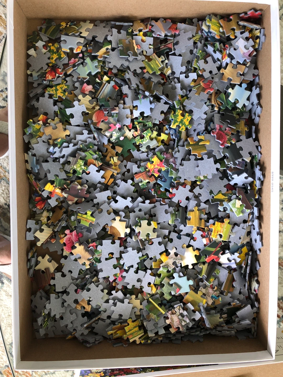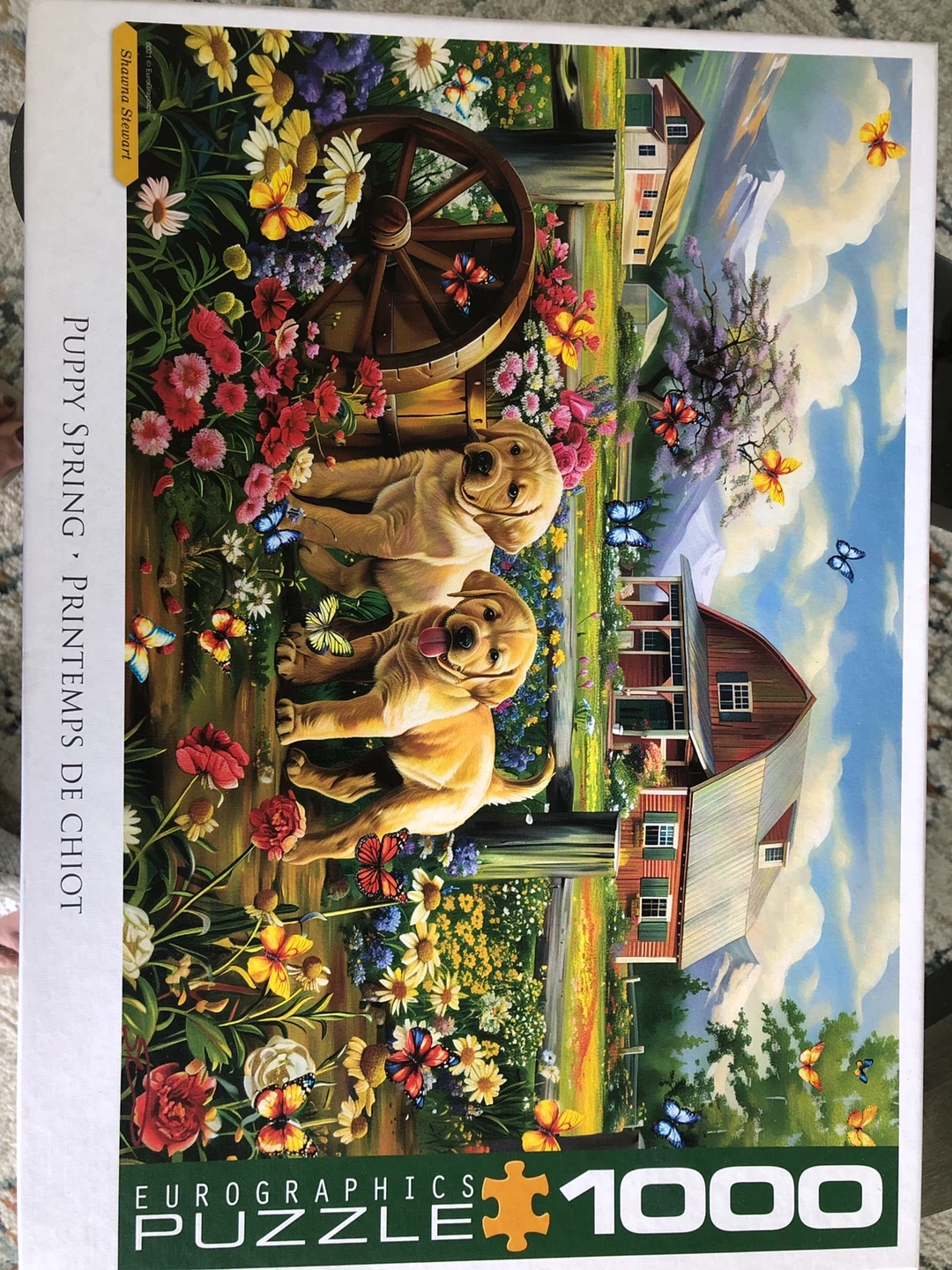 Looking to sell a Eurographics 1000-piece puzzle called Puppy Spring! It features a charming scene with puppies, flowers, and a rustic farm setting. Perfect for puzzle enthusiasts and anyone who loves a relaxing activity. All pieces are included and in great shape