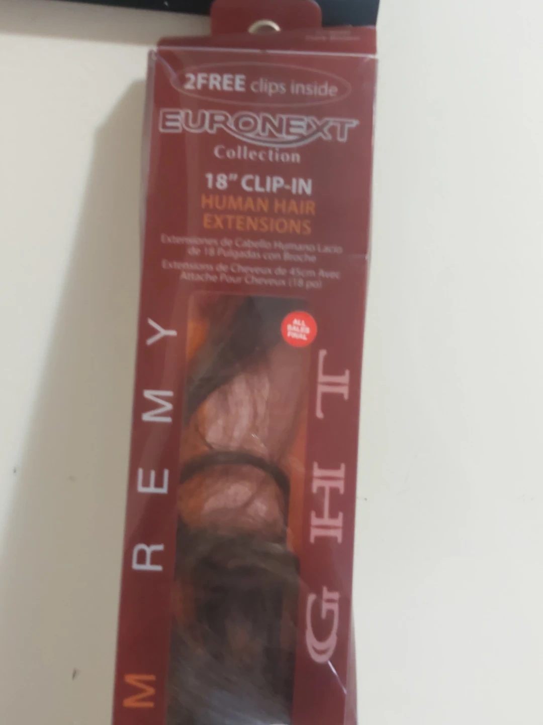 10Selling a brand new Euronext Remy de Prima 18" clip-in human hair extensions kit in dark brown! This kit includes ten pieces and also comes with 2 free clips inside. Perfect for adding length and volume to your hair