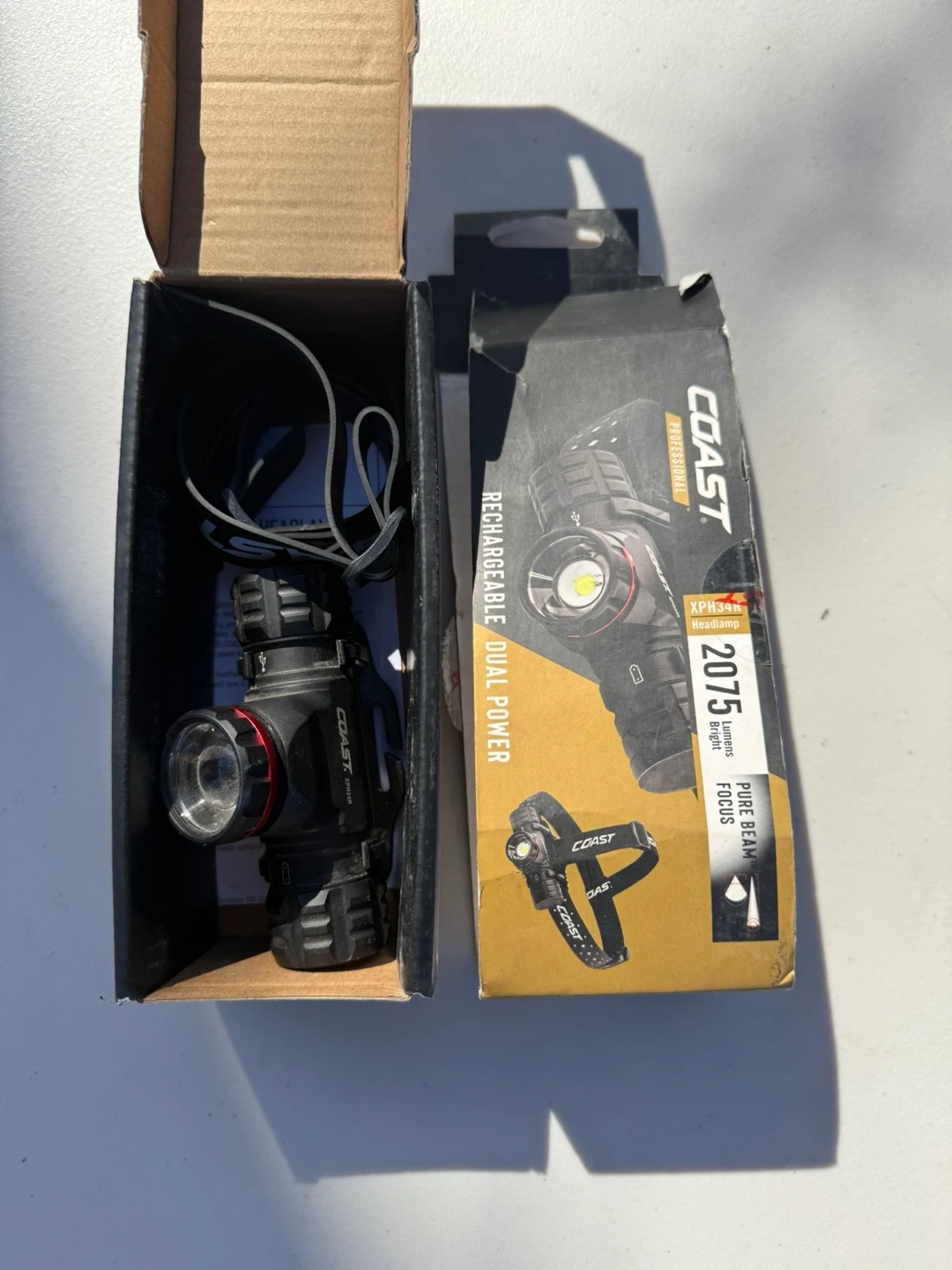 This is a Coast Professional rechargeable dual power headlamp. It offers pure beam focus with 2075 lumens. It comes with its original box and accessories.