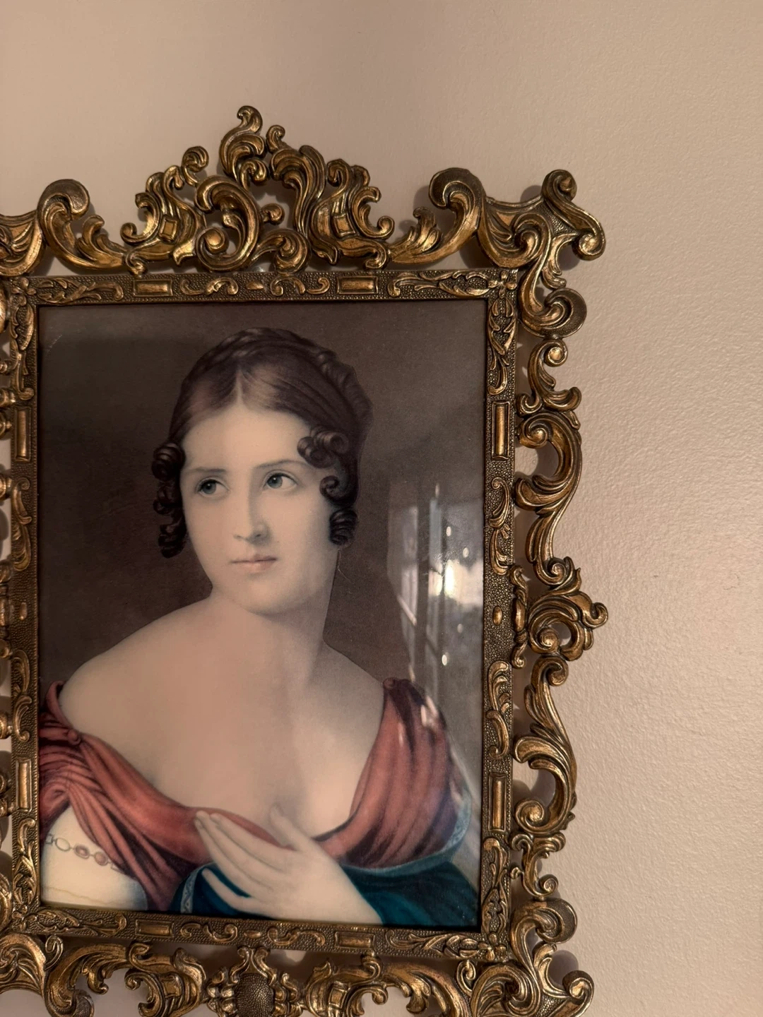 This vintage framed portrait painting depicts a woman with curled hair and a red draped gown. The frame is ornate and gold-gilt. It's a lovely decorative piece for any room.