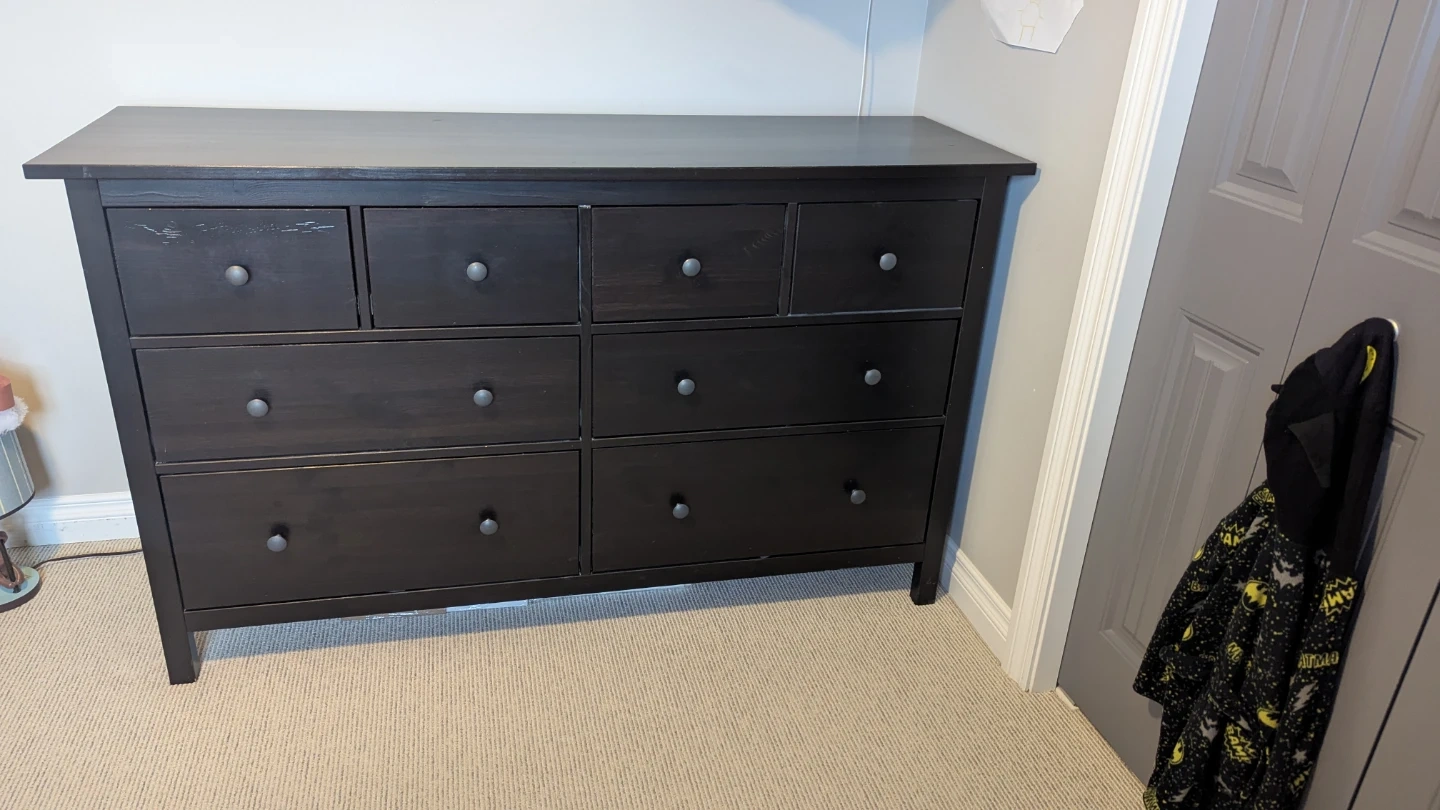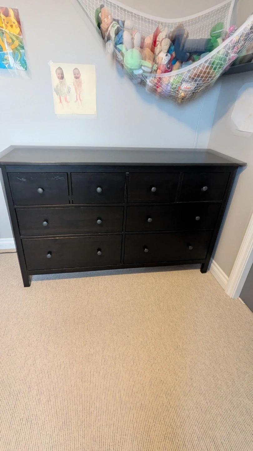 This is a black dresser with seven drawers. It has two rows of drawers; the top row has four smaller drawers, and the bottom row has three larger drawers. It's perfect for organizing clothes or other bedroom items.