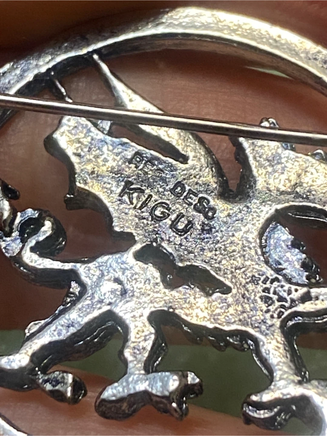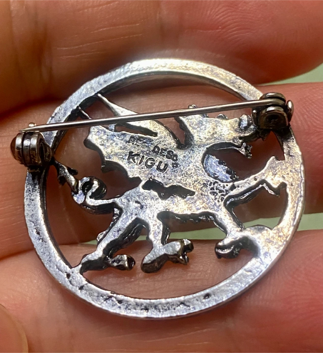 This is a vintage KIGU silver-tone brooch pin. It features a detailed dragon design within a circular frame. A unique accessory for any collection!