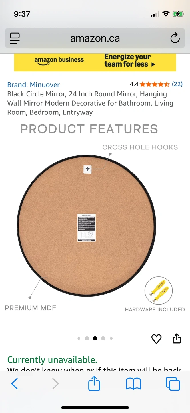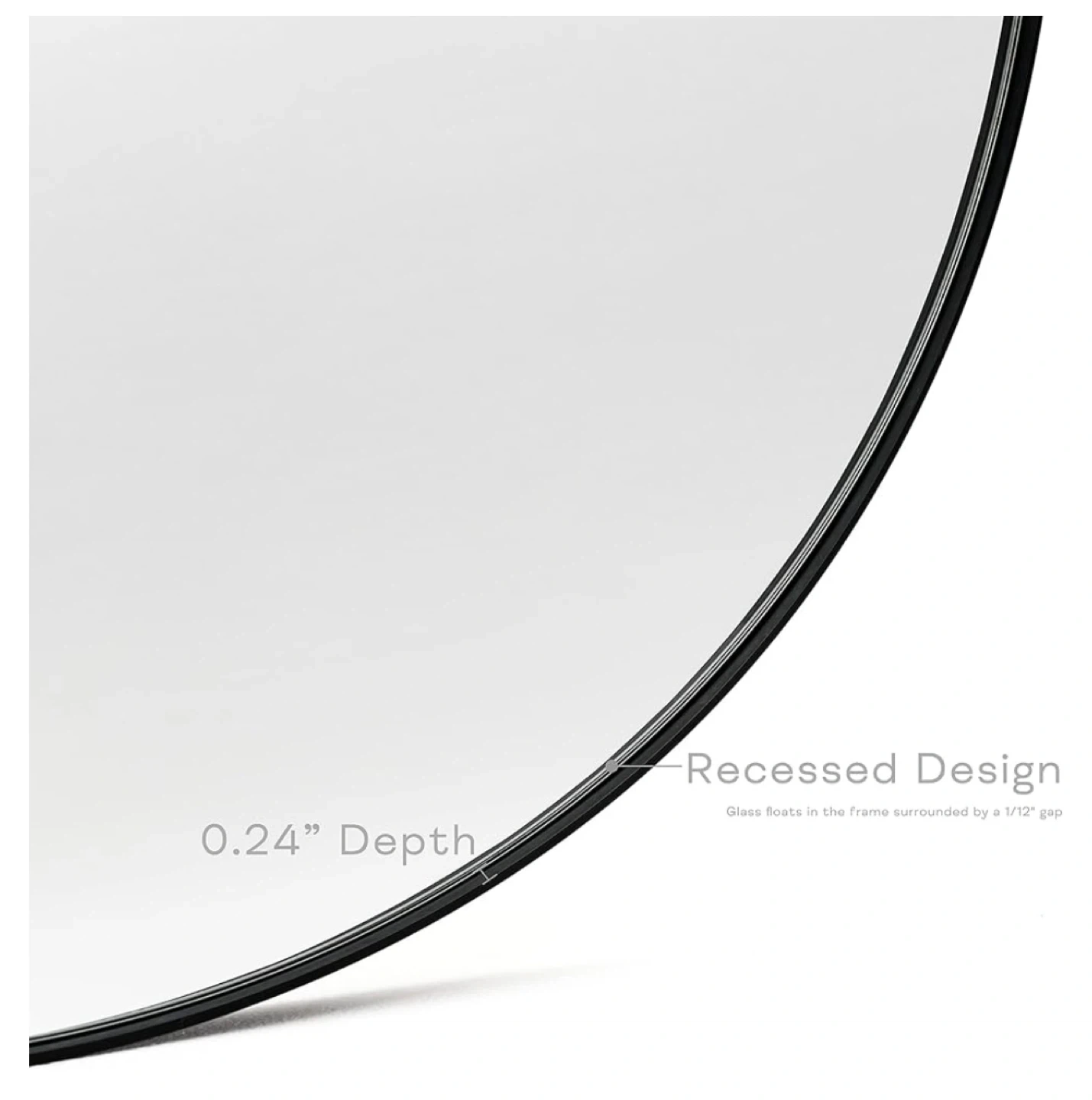 This 24-inch round mirror features a sleek black brushed metal frame. It's an HD silver mirror with no distortion and a 0.24" depth. The recessed design floats the glass within the frame, surrounded by a 1/12" gap.